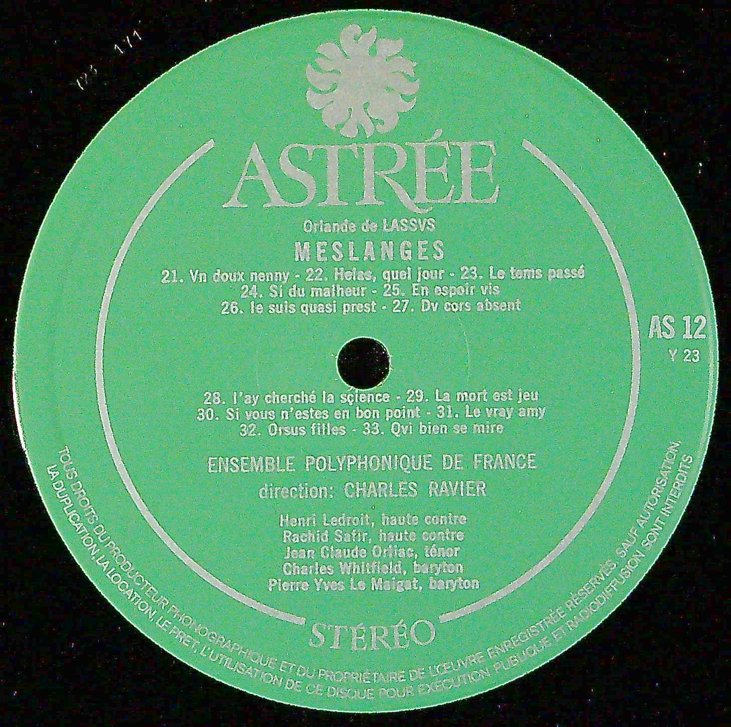 商品コード:1385-050[ASTRÉE] C.ラヴィエ指揮フランス・ポリフォニックEns. / ラッソ:4声のシャンソン曲集2巻(21~44番)