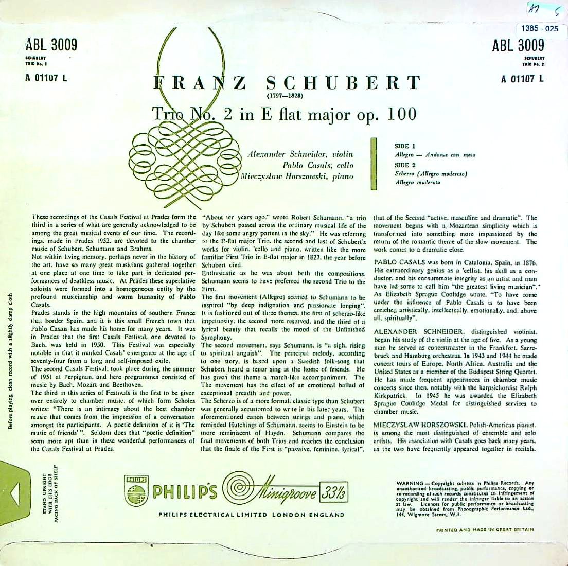 商品コード:1385-025p[PHILIPS] カザルス(vc) シュナイダー(vn) ホルショフスキ(pf) / シューベルト:Pf三重奏曲2番Op.100
