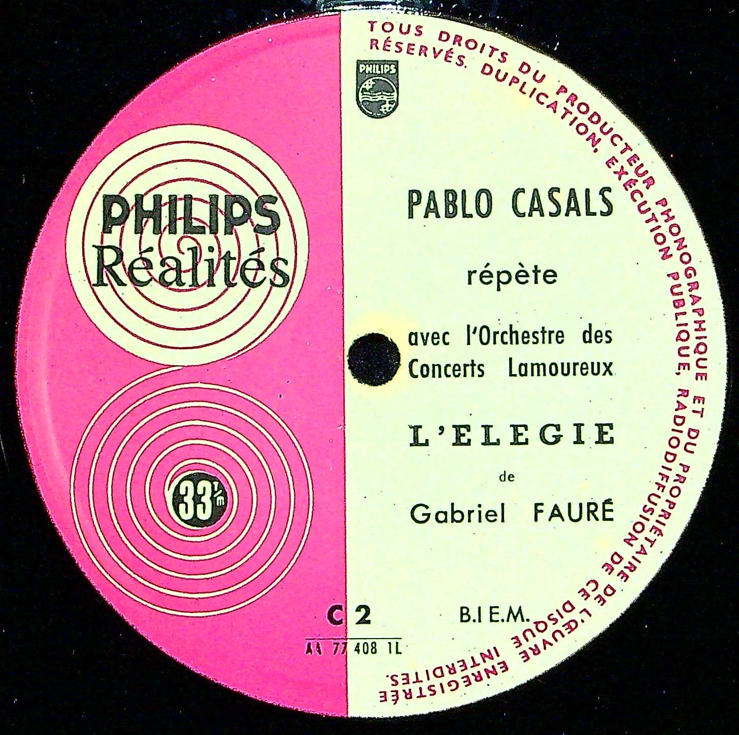 商品詳細:Hommage A Pablo Casals・カザルスに捧げると題されたシリーズ。1956年パリ・ソルボンヌ大学でのライブ・コンサートと、そのリハーサル風景(A面)。フォーレのエレジー(通常はVcとPfの二重奏)を管弦楽伴奏版で演奏。B面はその本番のコンサートとカザルス自作の2曲・Les Rois MagesとSerdane、そして最後にバッハの無伴奏Vc組曲5番からサラバンドをソロで演奏。B面には4曲が入る。この時期、カザルスはスペイン軍事政府に抵抗して、演奏活動を停止していた。その中で本人が演奏したバッハこそが、このLPの聴きものである。身震いをする程の霊的な演奏だ。尚、L 77408 Lは初出ではなく、RealitesシリーズのC 2というレコード番号で1958年頃全く同じ内容で発売された。これは1959年頃のプレスで発売年の差は1年程度と思われる。エレジーの管弦楽伴奏版は1890年に指揮者エドゥアール・コロンヌの要請によってオーケストレーションを施された版でチェロと管弦楽伴奏で演奏される。編曲はフォーレ自身によって行われ、1901年に出版された。初演は同年チェリストのパブロ・カザルスとフォーレ自身の指揮による。カザルスはこの管弦楽伴奏版の初演者であり、慣れ親しんだ曲を再演したことになる。リハーサルではコンセール・ラムルー管弦楽団 の他102人のチェロ・アンサンブル が参加している。カザルスはチェロと指揮の両方を担当。しかし本演奏では独奏チェロとコンセール・ラムルー管弦楽団 による演奏でカザルスはやはりチェロと指揮の両方を担当している。ライブ録音である。カザルスの作品である「サルダーナ」(Sardana)はカザルスを含む11人のチェロ奏者と102人のチェロ・アンサンブル で行われ、カザルスは指揮も担当。「東方三博士」(Les rois mages)は「サルダーナ」と全く同じ構成で演奏される、舞踊を元にしたチェロ・アンサンブル曲である。なんといってもこのLPのハイライトは最後の5分程度のバッハ:無伴奏Vc組曲5番よりサラバンドにある。カザルスの唸り声とともに紡ぎ出される音は正に神がかっている!