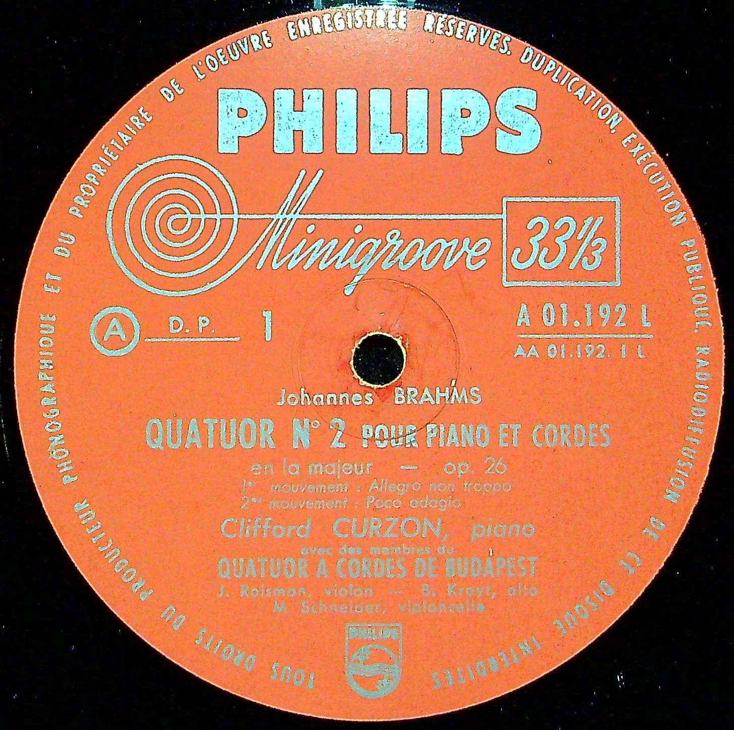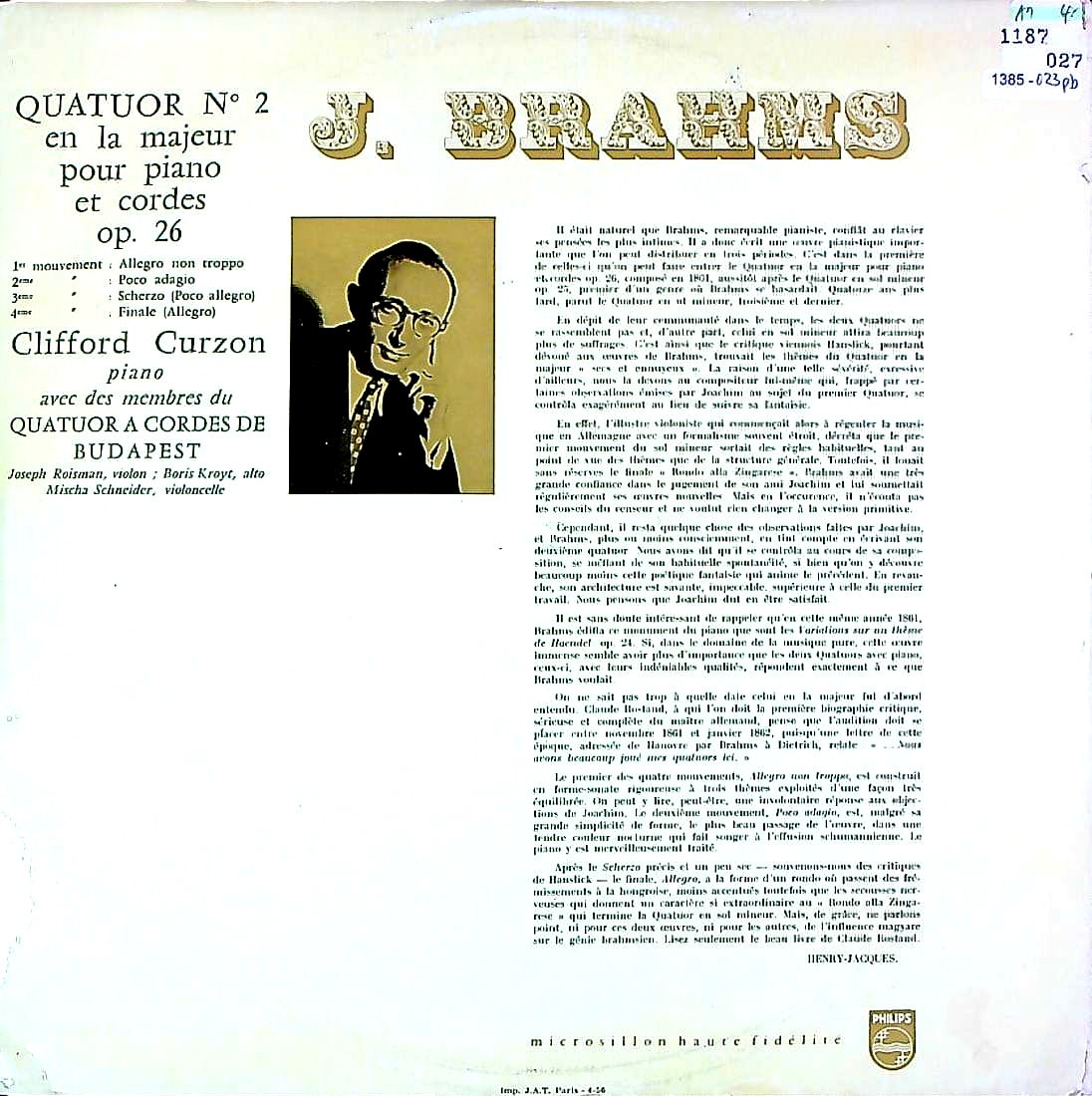 商品コード:1385-023pb[PHILIPS] C.カーゾン(pf) ブダペストQt.メンバー/ ブラームス:Pf四重奏曲2番Op.26