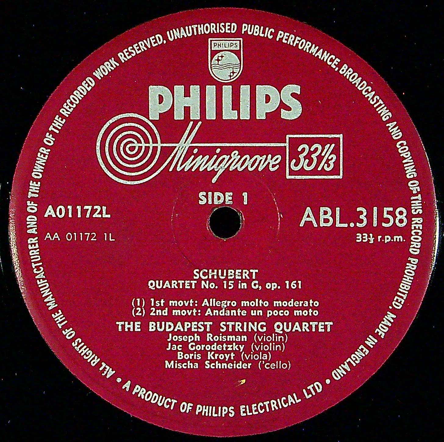 商品コード:1385-021[PHILIPS] ブダペストQt. / シューベルト:弦楽四重奏曲15番D.887