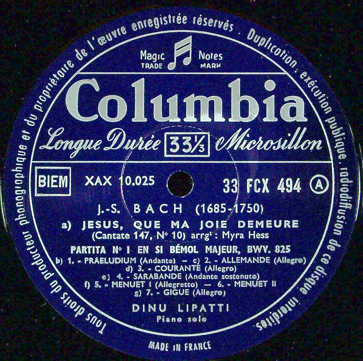 商品コード:1385-007[COLUMBIA] D.リパッティ(pf) / バッハ:主よ、人の望みの喜びよBWV.147, パルティータ1番BWV.825 他, モーツァルト:Pfソナタ8番K.310