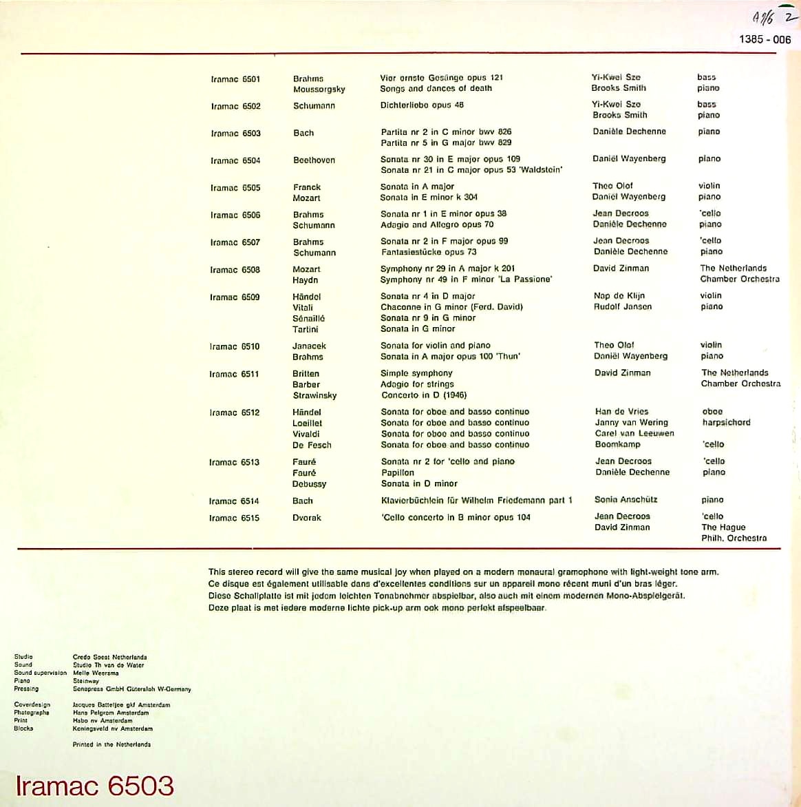 商品詳細:ダニエル・ドシェンヌは、1936年フランス生まれの女性ピアニスト。1957年両親の故国であるオランダに移住し、オランダで活動を始める。オランダIRAMACに録音を残している。バッハはこの2曲のみで、ソロは他には見ない。男性的な力強い演奏だろうか。古いヴィルトーゾのような雰囲気を取り込むタイプではなく、自身の弾(はじ)いたピアノの音のみで勝負している(そうしなければならない環境)。その為、一打一打は確信に満ちており、迷いや曖昧さが無い。明確なタイプとして評価できる。強い打鍵が様になるピアニスト。男性的なパワーのあるスタイルだが、表現は豊かで音楽は芳醇である。ドシェンヌはIRAMAC以外のLP録音は入荷が無く、他のレーベルには無いのかも知れない。CD期になってショパンなどのソロ録音がある。ダニエル・ドシェンヌに関する情報はあまり無いが、パリ音楽院でラザール・レヴィに師事している。1954年の音楽院内コンクールでプルミエ・プリを取っている。ジュネーヴとボルツァーノで行われたコンクールで入賞したらしいが詳細は不明。オランダの多くのオーケストラと共演を行い、ドイツ、フランス、スイス、イタリア、英国、ノルウェー、スウェーデンにも活動の範囲を伸ばした。コンセルトヘボウの首席チェリストであるジャン・デクロースとデュオを組んで多くのソナタ録音を行った。IRAMACというマイナーレーベルにしか録音がないことがその音楽家の評価となってはならない。