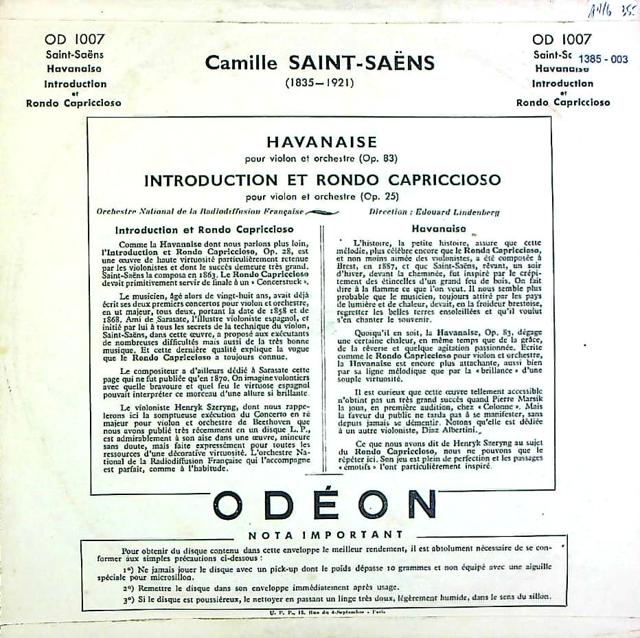 商品コード:1385-003[ODÉON] H.シェリング(vn)/ サン・サーンス:VnとハバネラOp.83, 序奏とロンド・カプリチオーソOp.28