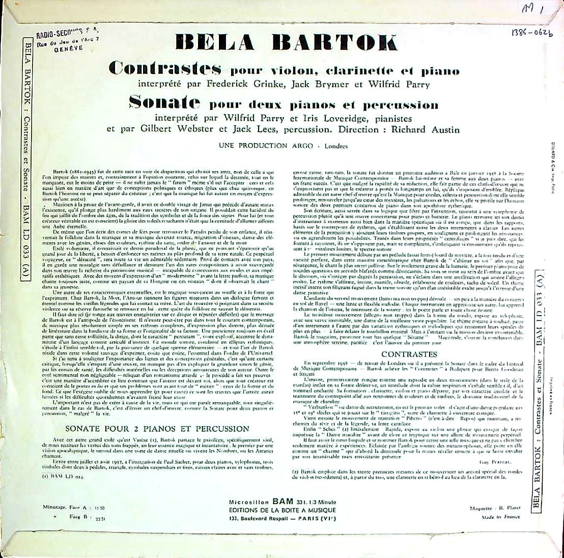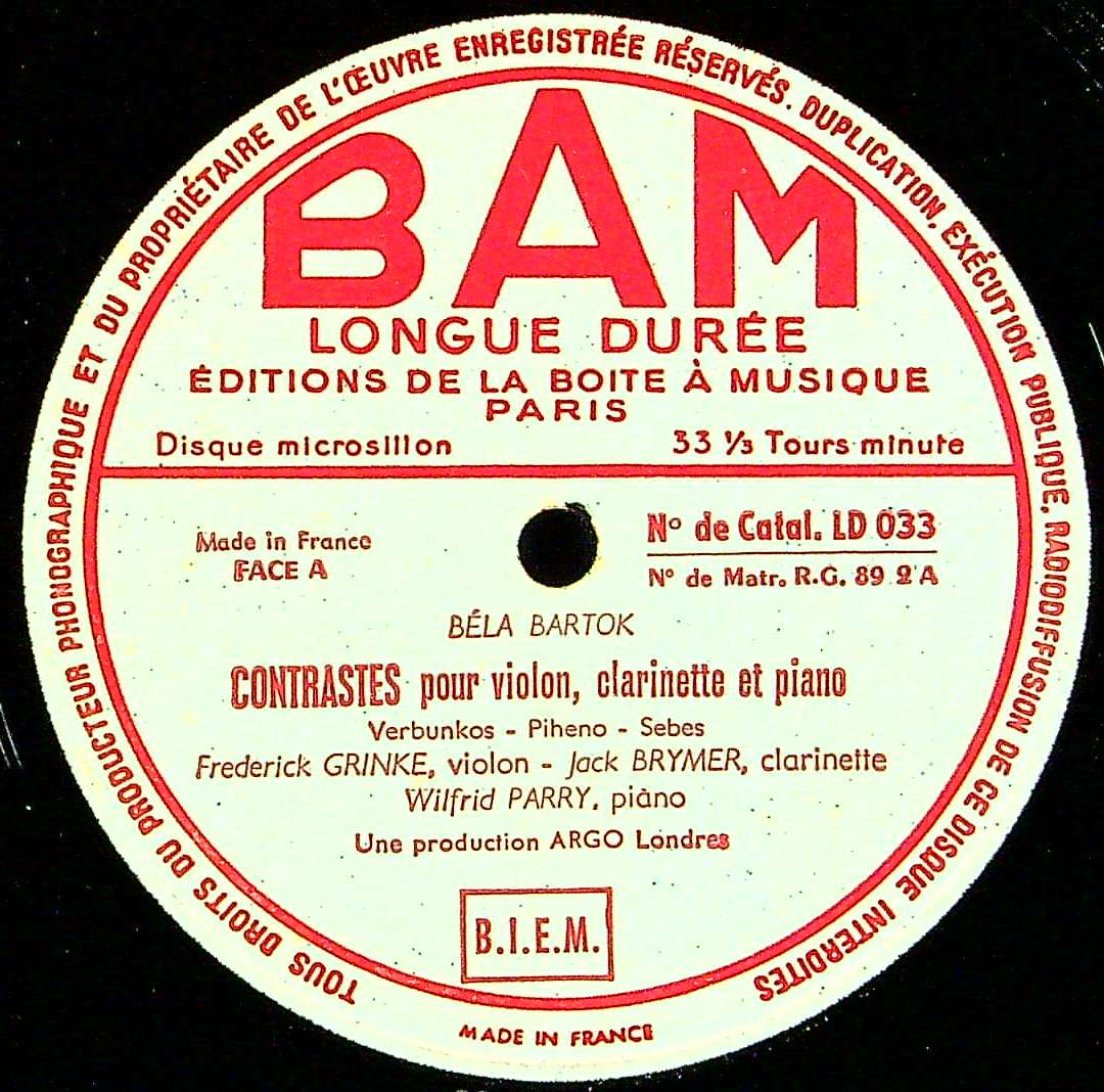 商品コード:1386-062b[BAM] F.グリンキ(vn) J.ブライマー(cl) W.パリー(pf) 他/ バルトーク:コントラスツSz.111, 2Pfと打楽器のためのソナタ Sz.110
