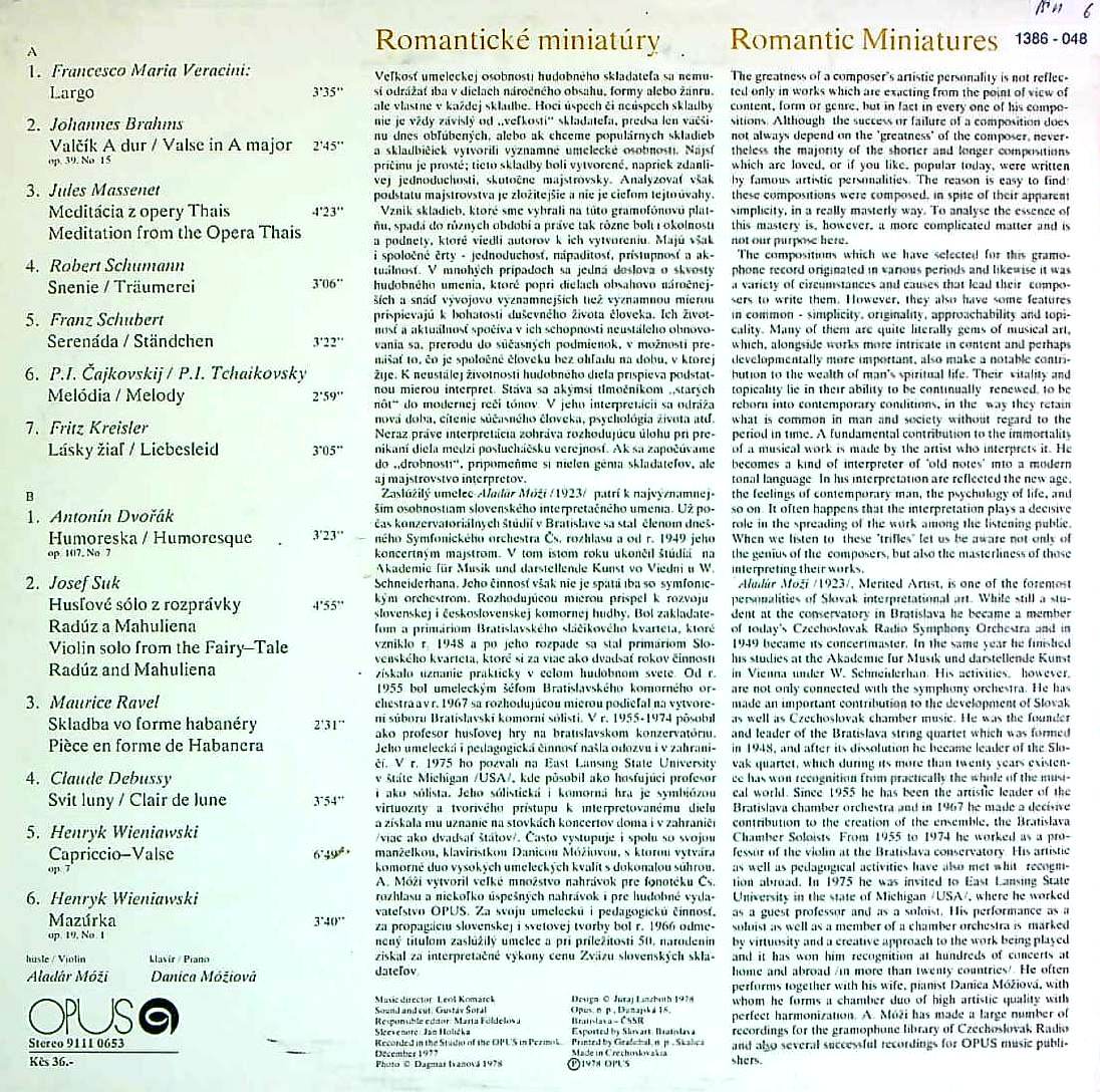 商品詳細:アラダール・モージ(1923-1983)は現スロバキア生まれのヴァイオリン奏者。地元で オタカール・シェブチクの弟子グスタフ・ナーフロフスキーからヴァイオリン演奏の基礎を学ぶ。 ブラチスラヴァ音楽院でティボル・ガシュパレク、ウィーンのアカデミー・フュル・ムジーク・ウント・ダーステレンデ・クンストでヴォルフガング・シュナイダーハンに学ぶ。ブラティスラヴァのチェコスロバキア放送交響楽団のコンサートマスターになる。ブラティスラヴァ室内管弦楽団の指揮者。1956年にスロバキア四重奏団を結成し、リーダーで第1Vnを務める。1960年頃からブラティスラヴァ音楽院にて教育者としても活動する。1974年からブラティスラヴァ演劇芸術アカデミーで教師として後進の指導に当たる。ソロ活動はそれほど豊富ではなったが、ヴァイオリン奏者及び教育者としての活動は多岐にわたる。チェコスロバキア放送のアーカイブに保管されている35のコンサート、100のソナタ、約300の小品の録音は、モージが非常に活発なヴァイオリニストであったことを証明しており、海外でも大きな関心と評価を集めている。スロバキア地域におけるヴァイオリン界の重鎮であった。彼は1975年のアメリカ滞在中に高い評価を受け、後に音楽家として活躍した。日本の教育者、東京の読売日本交響楽団のコンサートマスターと指導者としても活躍。1983年に亡くなった。スロバキア四重奏団としてはSUPRAPHONに数点のLPがあり、ソロ奏者としての録音はOPUSに数点がある。これはピアノ伴奏の小品集でモージを知る上での代表作といえる1枚。全13曲の小品を丁寧に美しく演奏している。古い録音ではないが、音質も良く、心に残る1枚となるだろう。尚モージはモジ、またはモッジでも通用すると思われるが当社ではモージで統一する。西側なら同じ内容のLPは更に高額となるだろう。