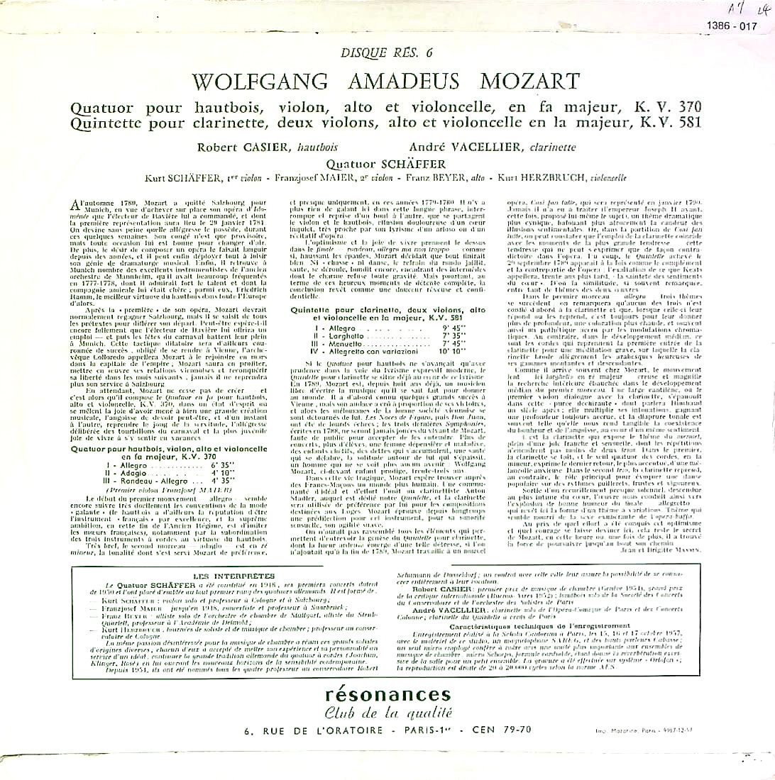 商品コード:1386-017[Résonances] A.ヴァセリエ(cl) R.カシエ(ob) シェッファーQt. / モーツァルト:Ob四重奏曲K.370, Cl五重奏曲K.581