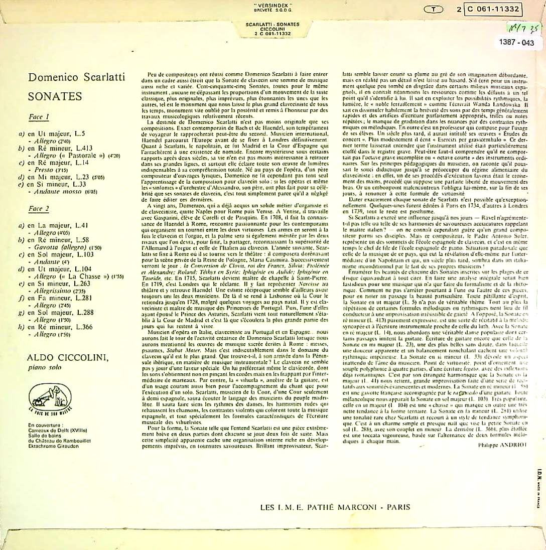 商品コード:1387-043p[VSM] A.チッコリーニ(pf) / スカルラッティ:ソナタ集(13曲)/K.1, K.9, K.64, K.87, K.159, K.239, K.259, K.268, K.377, K.380, K.406, K.432, K.492