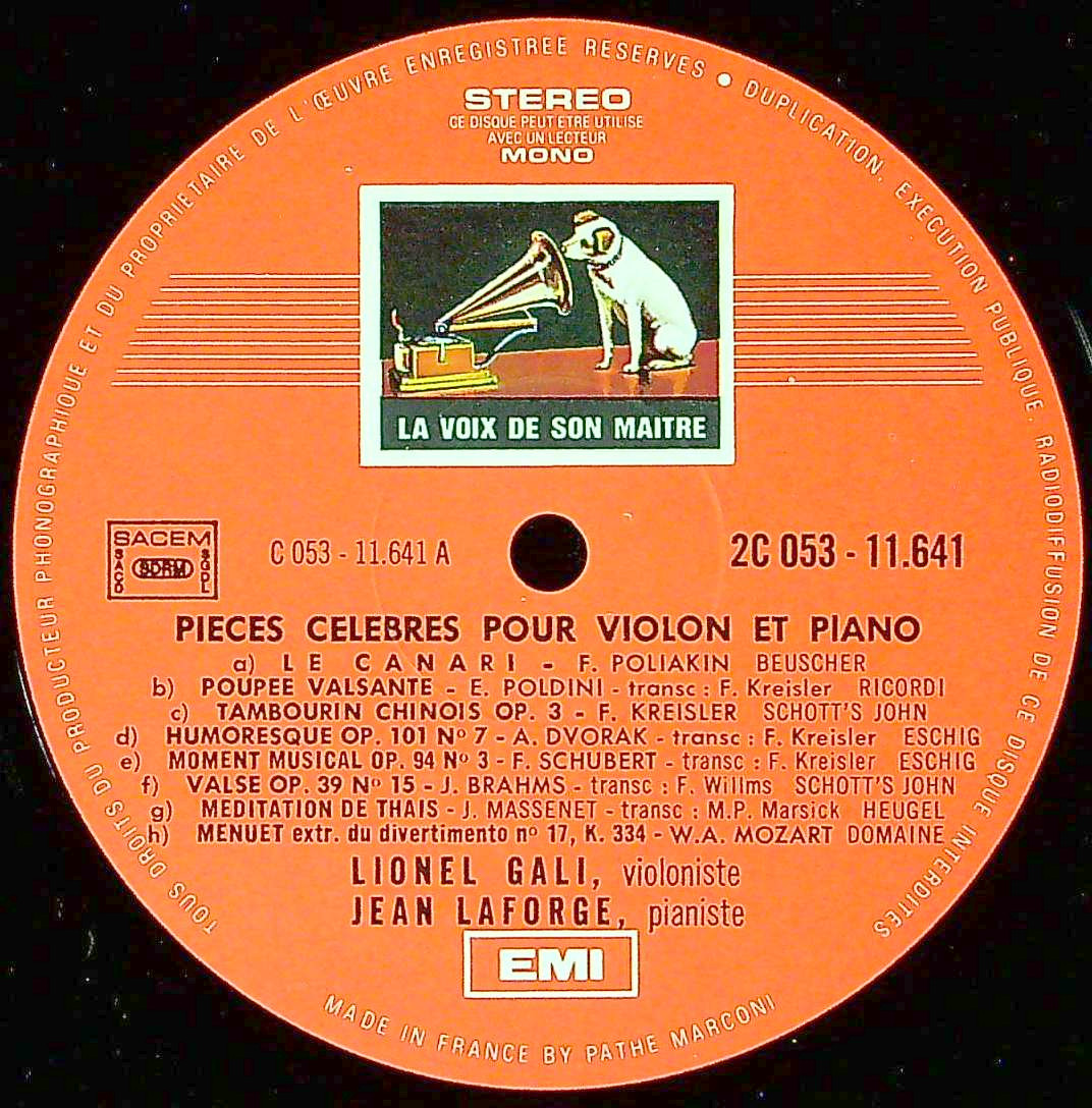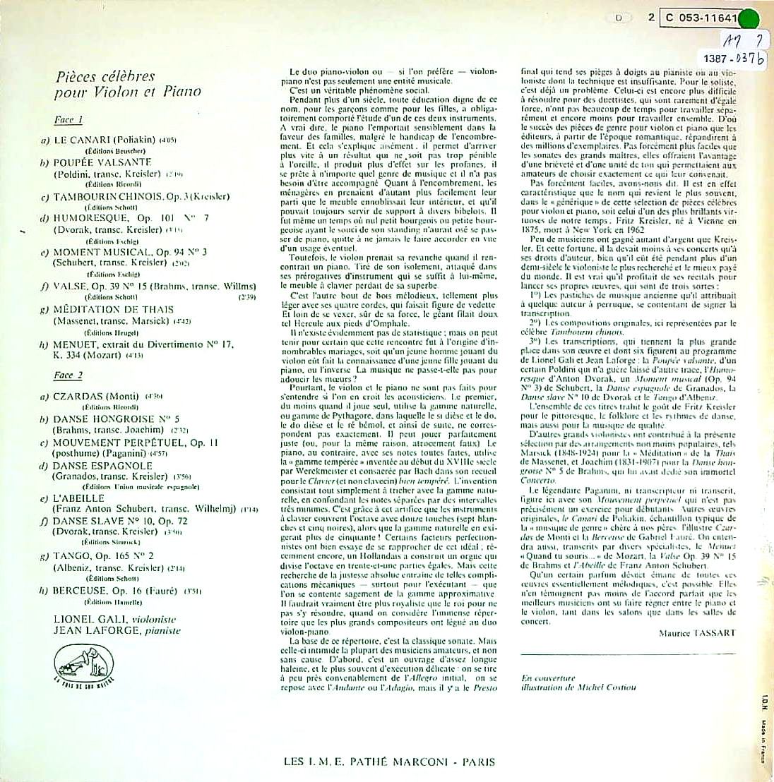商品詳細:1972年初出の珍しいVn小品集。全16曲入り。'70年代に入って、このような企画は多くない。ピアノのラフォルジュはCNDレーベル等で有名なピアニストだが、Vnのガリは今まで聞いたことのない人。リオネル・ガリと同じ名のヴァイオリニストがBlue Noteに録音を残しており、Jazz系の人なのかも知れない。JAZZ界にもグラッペリのように優れたVnはいる。同一人物なのか不明だがパリ器楽グループのメンバーであったことは解かっている。パリ器楽グループはおそらくJ.ラフォルジュ(pf)L.ガリ(vn)B.パスキエ(va)R.ベー(vc)の4人ではないかと思われる。日本では「新フランス音楽のエスプリ・シリーズ」とのタイトルでサン・サーンスの室内楽曲集を発売していた。1曲1曲の完成度の高さ、節回し等から、若手ではなさそうだ。Vn好きならば、絶対お薦めの一枚!1970年代録音のVn小品集としては最高ランクの内容!入荷は多くない!当LPのフランス語タイトル:「Pièces Célèbres Pour Violon & Piano」。