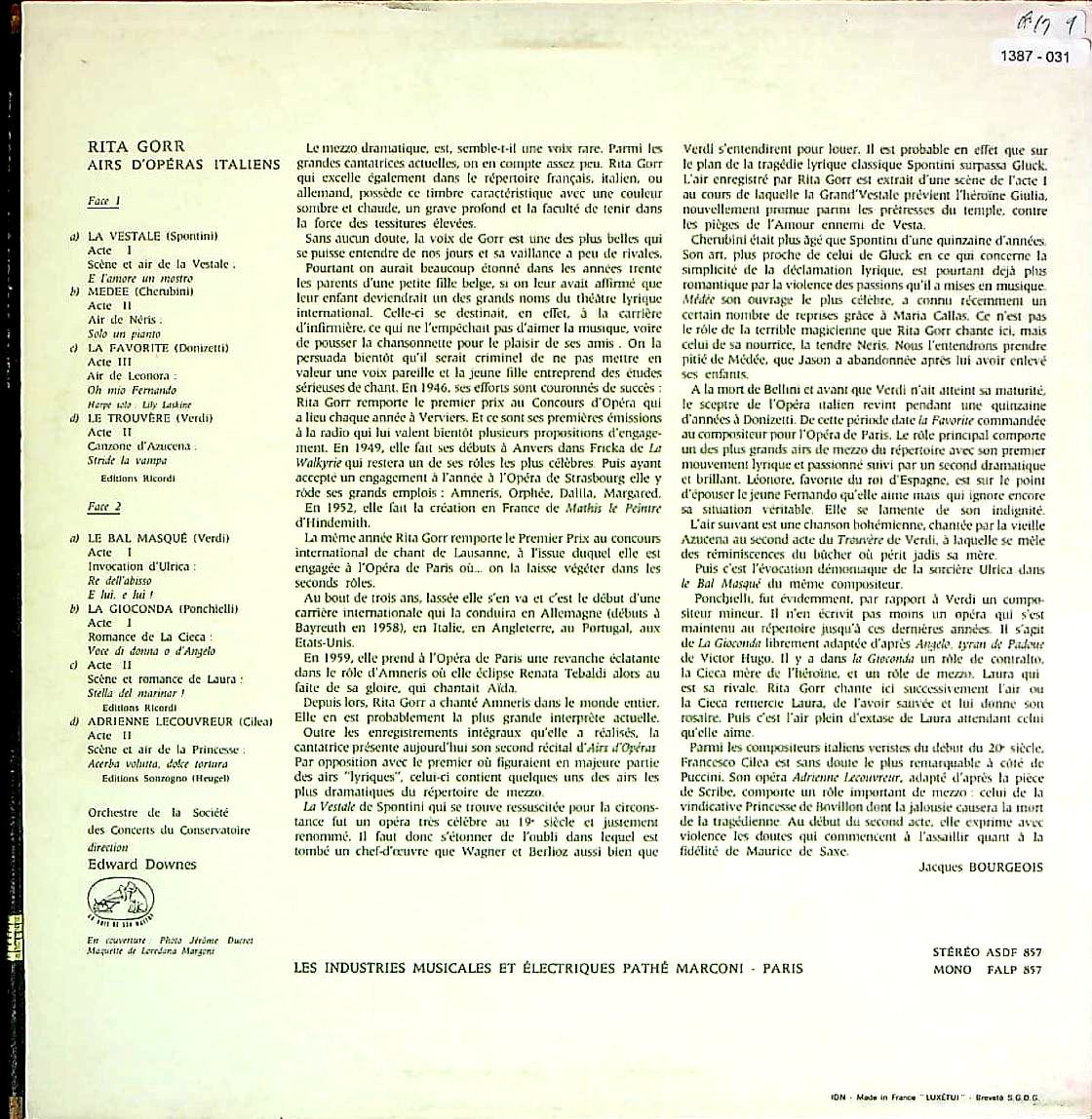 商品詳細:ASDFのオーディオファイル。確かに、彼女が10才くらい若返ったようなクリアーで迫力のある再生音。声に張りと湿気があり、妙に生々しい。8曲のオペラ・アリアを収録。1926年ベルギー生まれの彼女の本名はMarguerite Geirnaertという。リタ・ゴールは芸名?クレスパンのように非常に良く通る声で、若々しささえ感じる(この時、おそらく40才前後と思われる)。パリ音楽院o.のバックに、音域も広く、実力のあるソプラノ。フランス語圏で有名。ソプラノ歌手、リタ・ゴールは1926年、ベルギーのゼルザーテ生まれで2012年1月22日スペインで亡くなった。享年85才。1946年のスイス、ベルビエでのコンテストで1等賞を受賞し、同年アントワープで《ワルキューレ》のフリッカ役でデビュー。さらに1952年にはローザンヌでのコンテストで優勝し、同年にパリ・オペラコミーク座でデビュー(ウェルテルのシャーロット役)、続いて《ニュルンベルクのマイスタージンガー》でパリ・オペラ座デビューを果たした。バイロイト音楽祭に初めて登場したのは1958年で、なんと81才まで現役で舞台に出ていた。スケールが大きく、豊かな声量、淀みのない歌唱、幅の広いレパートリーを持つ。