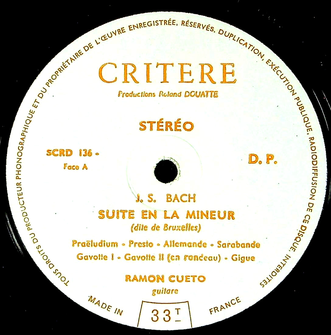 商品詳細:このLPのA面のバッハ:リュート組曲第3番B.995はちょっとした問題作である。通常のB.995は無伴奏Vc組曲第5番ハ短調B.1011をバッハ自身が編曲したもので、自筆版が存在している。「ブリュッセル稿」と呼ばれるブリュッセルの図書館で発見されたB.995はト短調で、これはバッハの弟子がリュートで弾きやすい様に移調し、更に若干の編曲を加えた写本。そして「ブリュッセル稿」はもう一つ写本があり、こちらはト短調(リュート版)を元にイ短調に移調した上に構成にまで手を付けた異稿である。1楽章目のプレリュードが途中で終わり、中盤以降のフーガ部を2楽章として独立、本来の3楽章目にあたるクーラントを全てカットという、弟子が書いたのかも怪しげな版である。当盤のリュート奏者ラモン・クエトは、敢えてこの「ブリュッセル異稿版」での演奏を選んだ様である。ちなみに近代のギタリストの殆どがイ短調での演奏を行っているが、これは自筆版あるいはブリュッセル稿版からの編曲で、クーラントのカットは行っていない。B面にはヴィヴァルディの2曲で最初のリュート協奏曲 ニ長調はソロがギター+2Vnで、バックをVc、Cembで担当、2曲目の三重奏曲は原曲の通りギター、Vn、Vcの3人での演奏。ギターのラモン・クエト(1932-2010)はスペイン・バルセロナ生まれ。地元でセゴビア楽派とも親交があったプジョールに師事。パリ・ギター・アカデミーでクラシックギターを学ぶ。1960年、ラモン・デ・セビージャという名義で、ソレア、シギリージャ、ファンダンゴ、タンギージョ、サパテアードの5つのパロを収録したEPを録音した。特にスペイン音楽のレパートリー、マヌエル・デ・ファリャ、アルベニス、グラナドスに秀で、これらの曲は多くの編曲版を手掛けた。フェデリコ・ガルシア・ロルカの「ポエマ・デル・カンテ・ホンド」をVEGAに録音している。Critèreには2枚の12"盤があり、これはその1枚。もう1枚はLe Livre D'Or De La GuitareというタイトルでCRD 135で発売された。パリのクラブ「プラン・ヴァン」でよく演奏していたらしい。録音は少ないがフランスでは知られたギター奏者だったようである。テンポも良くじんわりと沁みるような演奏である。クエトの卓越した技量のお蔭だろう。