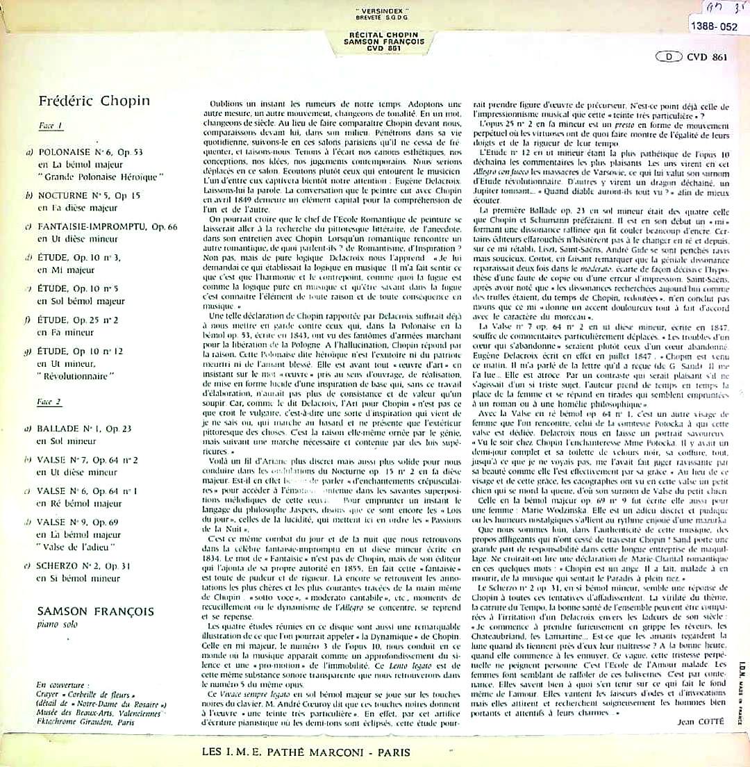 商品詳細:1960年サル・ワグラムでのショパン・リサイタル。1952年のFCX 180とは別録音。ショパン・リサイタルはこの他1964年サル・プレイエルが最後。'50年代のリサイタル盤より自由度が増しているが、それは諸刃の剣であり、自由すぎて曲が崩壊してしまう事もあったという。この録音は乗りの良さが成功しているケース。10年後の1970年、不摂生がたたり亡くなった。あまりに感性頼みのピアニスト。刹那的できらめきが随所に表れる。「Unique Récital」というタイトルでFCX 861/SAXF 181→SAXF 861→CCA 861で仏COLUMBIAから発売された。1967年頃から全ての仏COLUMBIA音源はLa Voix De Son Maîtreに統一され、CVD 861(白SCニッパー小stereo段なし)で始まると思われる。中間には様々なプレスが存在し1980年代まで再版が継続したフランソワの代表的なショパン・リサイタルである。どの盤で聴いてもタップリのフランソワらしさを味わえると確信できる録音で、まさにユニークな演奏である。カラー切手レーベルはなかなか音質は良く値段はこなれている。曲は小品12曲。彼の洒落っ気のあるタッチは、ショパンが最もわかりやすく、冒頭のポロネーズ一つとっても、これだけ軽やかに、流麗に、この重い曲をこなせるピアニストは多くない。心憎い程のスタイリッシュなショパン!尚タイトルは「Unique Récital Au Théâtre Des Champs-Elysées」だが録音はシャンゼリゼ劇場ではなくサル・ワグラム(Salle Wagram)であるので注意。この録音は毎年のようにプレスが繰り返された人気盤でプレスの種類が非常に多い番号である。当社ではプレス世代で価格を調整しており、それなりの金額としている。プレスを全て把握しているから出来る安心な価格である。フランソワのショパンを何か1枚とお考えなら当録音をお勧めする!プレスの種類は多いが年代別に価格を反映している。