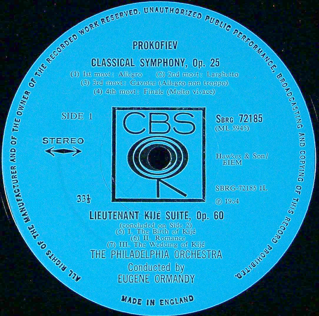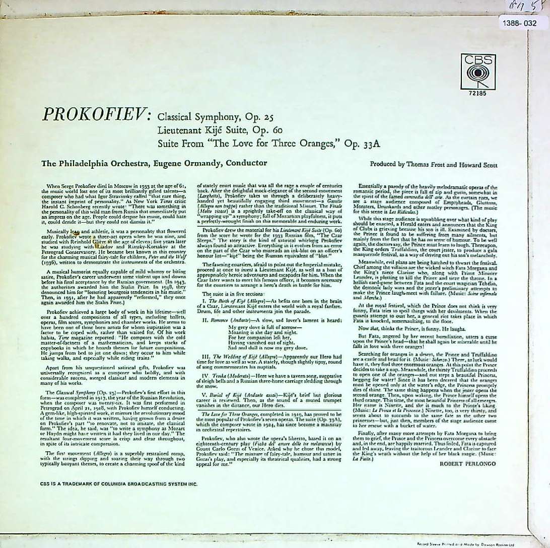 商品コード:1388-032[CBS] E.オーマンディ/ プロコフィエフ:交響曲1番「古典的交響曲」Op.25, 組曲「キージェ中尉」Op.60, 組曲「3つのオレンジへの恋」Op.33a