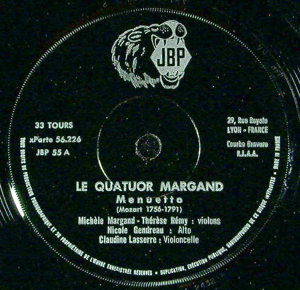 商品詳細:マルガン弦楽四重奏団はミシェル・マルガンをリーダーで第1Vnとするフランスの弦楽四重奏団。特徴は全員が女性奏者である。幸松氏の著書「世界の弦楽四重奏団とその録音」にも未記載の希少な団体。メンバーは第1Vn: Michèle Margand(ミシェル・マルガン)、第2Vn:Thérèse Rémy(テレサ・レミー)、Va:Nicole Gendreau(ニコール・ジャンドロー)、Vc:Claudine Lasserre(クラウディーヌ・ラッセール)の4人。フランス教育連盟が開催した「オリーブオイル文化ツアー」に関連した録音のようである。マルガンQt.の録音は少なく、過去に仏EDITIONS STUDIO:SM 1029(10")でルムラン:SQ/小組曲の録音がある。他にはマイナーレーベルに3点程あるようで当7インチ盤を含め全部で5枚程度で全てと思われる。ここではメジャーな作品から部分的な録音を行っているが、当初から33回転の7インチに収める予定なら仕方がないだろう。1960年代初期の録音・発売のようであるがはっきりした年代までは分からない。JBPレーベルの親会社は Jean-Baptiste Piazzano/Disques JBPでPiazzanoは人物名である。この人はフランスの録音技師で自らフランス・リヨンで立ち上げたレーベルがJBPレーベルである。その為音質は良い。ゆったりしたテンポで穏やかに奏でられた3つの作品。A面のモーツァルトを聴けば、この団体の音楽性が分かる。1950年代風のデリケートで豊かなソノリティは当時特有のものであり、また女性奏者だけのこの団体の特徴である。7インチだが33回転なので意外と収録時間は長い。当社でも初めて見る希少な7インチで初のJBPレーベルである。2度目はないとみて間違いない。