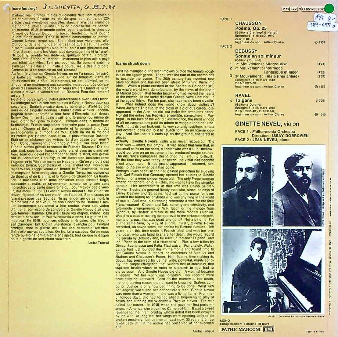 商品コード:1389-057b[VSM] G.ヌヴー(vn) J.ヌヴー(pf)/ ショーソン:詩曲Op.25, ドビュッシー:Vnソナタ, ラヴェル:ツィガーヌ