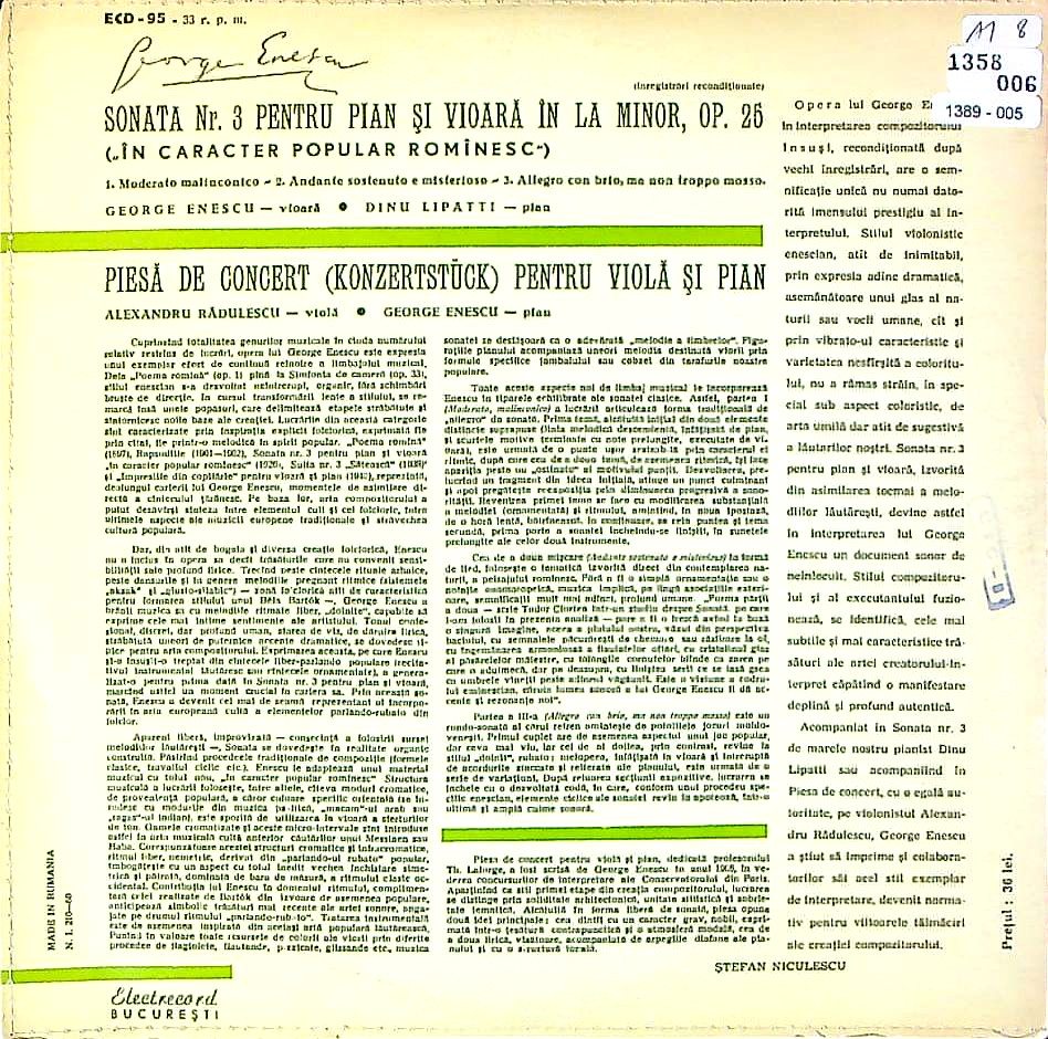 商品コード:1389-005[Electrecord] G.エネスク(vn)/A.ラドゥレスク(va)/ エネスク:Vnソナタ3番Op.25「ルーマニアの民俗風で」, 演奏会用小品