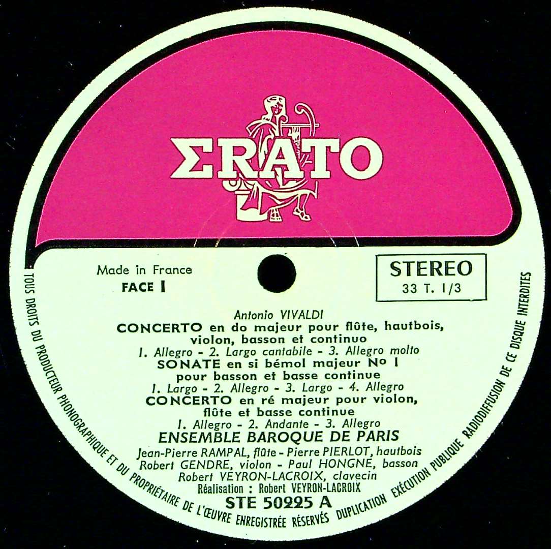 商品コード:REG-4448[仏ERATO] パリ・バロックEns. J.P.ランパル(fl) 他 / ヴィヴァルディ:Fl・Ob・Vn協奏曲, Vn・Fl協奏曲, Fl・Vn・Fg協奏曲, Fl・Ob・Vn・Fg協奏曲, Fgソナタ, Obソナタ