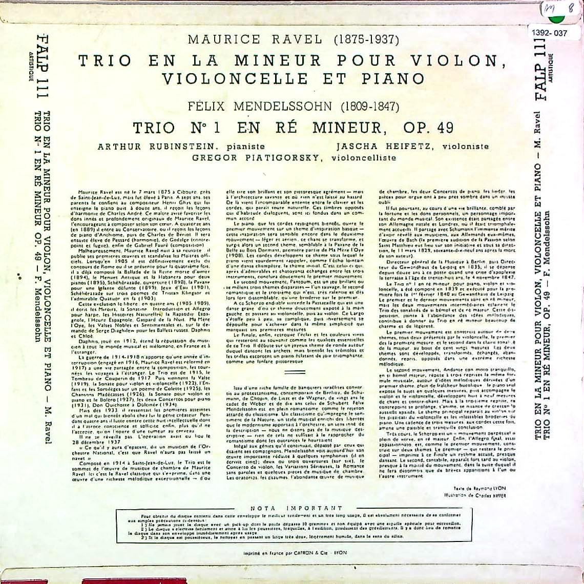 商品コード:1392-037[VSM] ルービンシュタイン ハイフェッツ ピアティゴルスキー/ メンデルスゾーン:PfトリオOp.49, ラヴェル:Pfトリオ1番Op.49