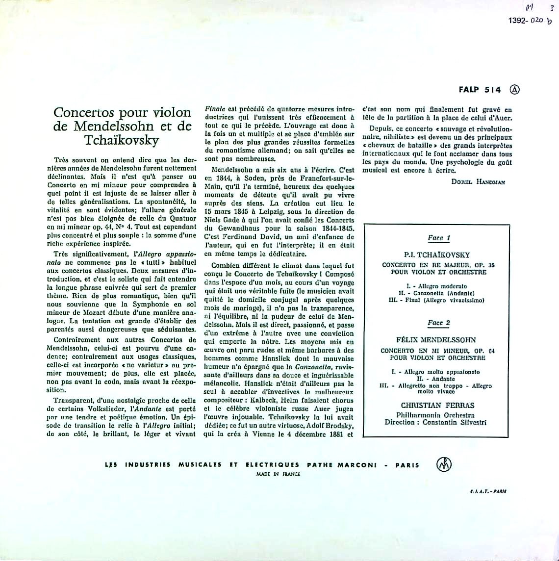 商品コード:1392-020b[VSM] C.フェラス(vn)/ チャイコフスキー:Vn協奏曲Op.35, メンデルスゾーン:Vn協奏曲Op.64