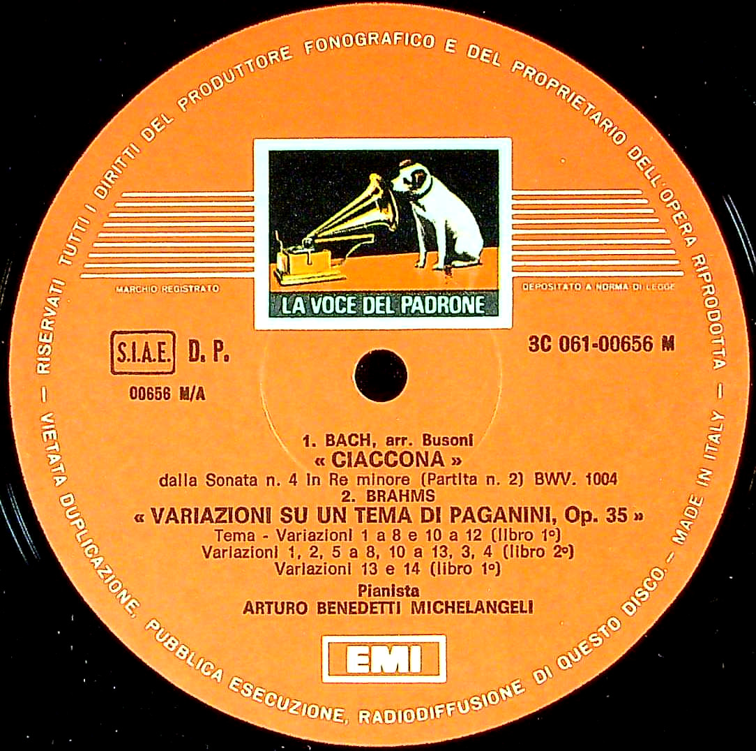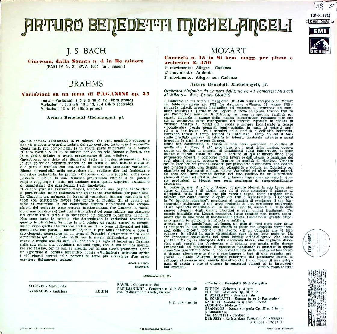 商品コード:1392-004[VDP(EMI)] A.B.ミケランジェリ(pf)/ バッハ:シャコンヌ, ブラームス:パガニーニ変奏曲Op.35, モーツァルト:Pf協奏曲15番K.450