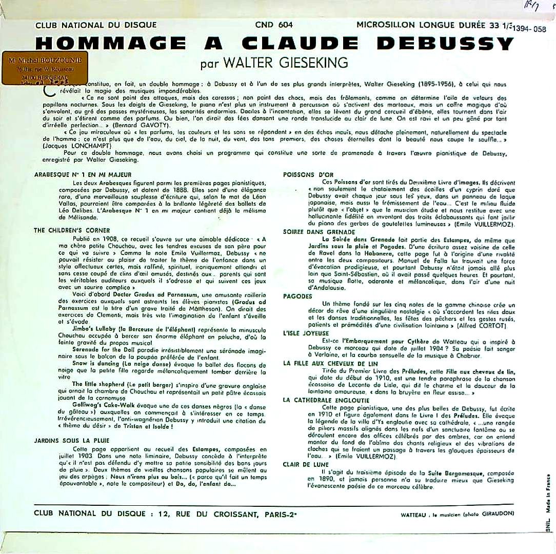 商品コード:1394-058[CLUB NATIONAL] W.ギーゼキング(pf) / ドビュッシーPf作品集