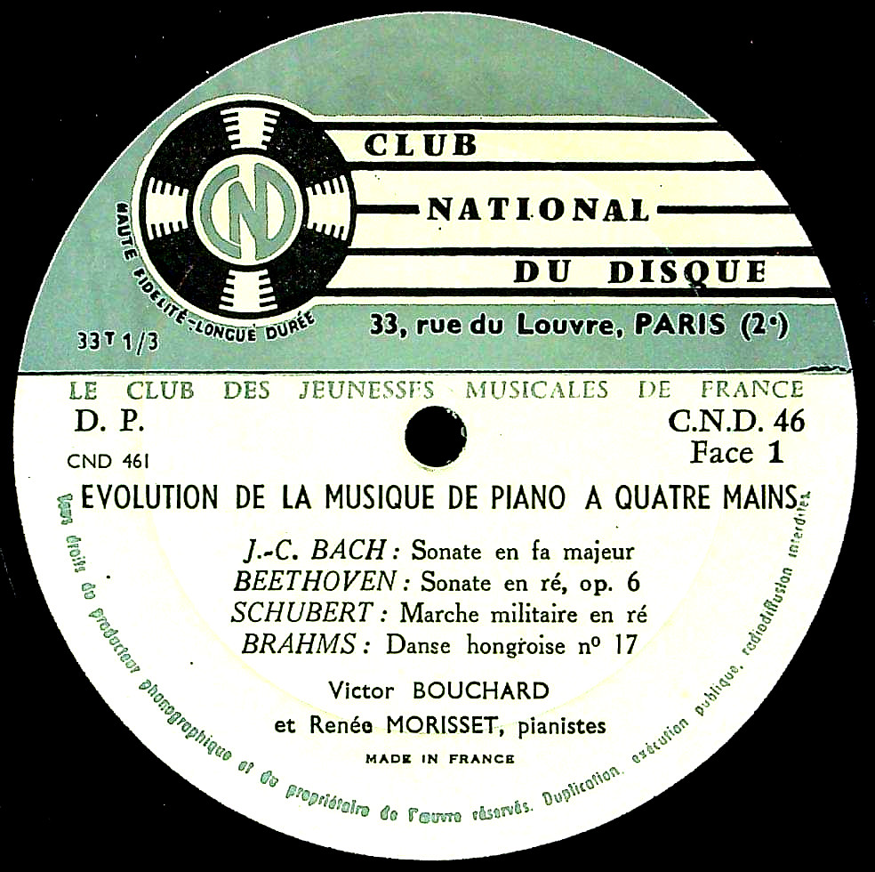 商品コード:1394-056[CLUB NATIONAL] V.ブシャール, R.モリゼ(pf) / ピアノ連弾の進化/J.C.バッハ, ベートーヴェン, シューベルト, ブラームス, ドビュッシー, ストラヴィンスキー, プーランク
