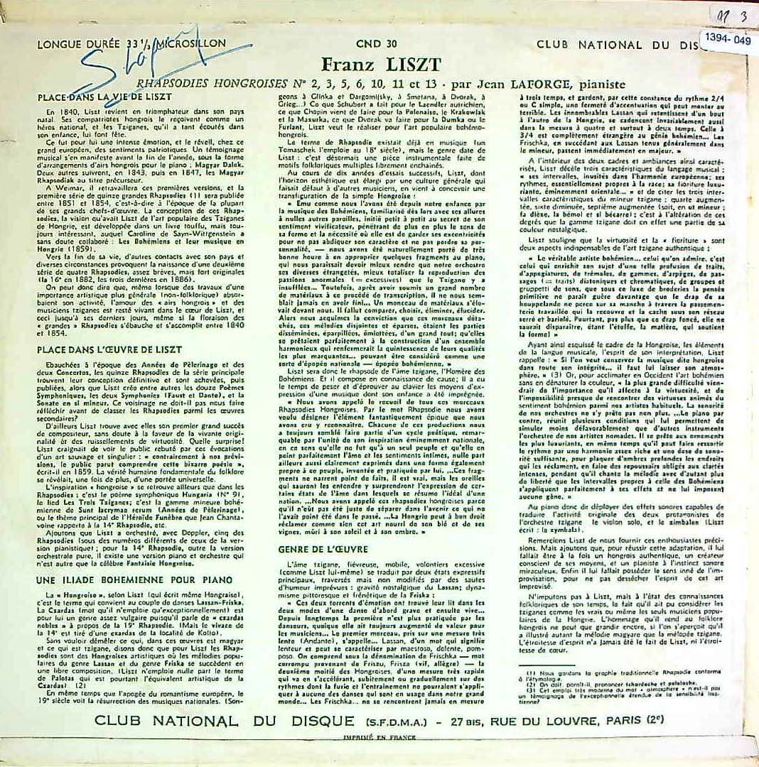 商品コード:1394-049[CLUB NATIONAL] J.ラフォルジュ(pf) / リスト:ハンガリー狂詩曲Vol.3/2&3番, 5&6番, 10&11番, 13番