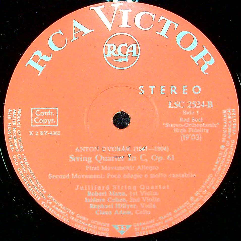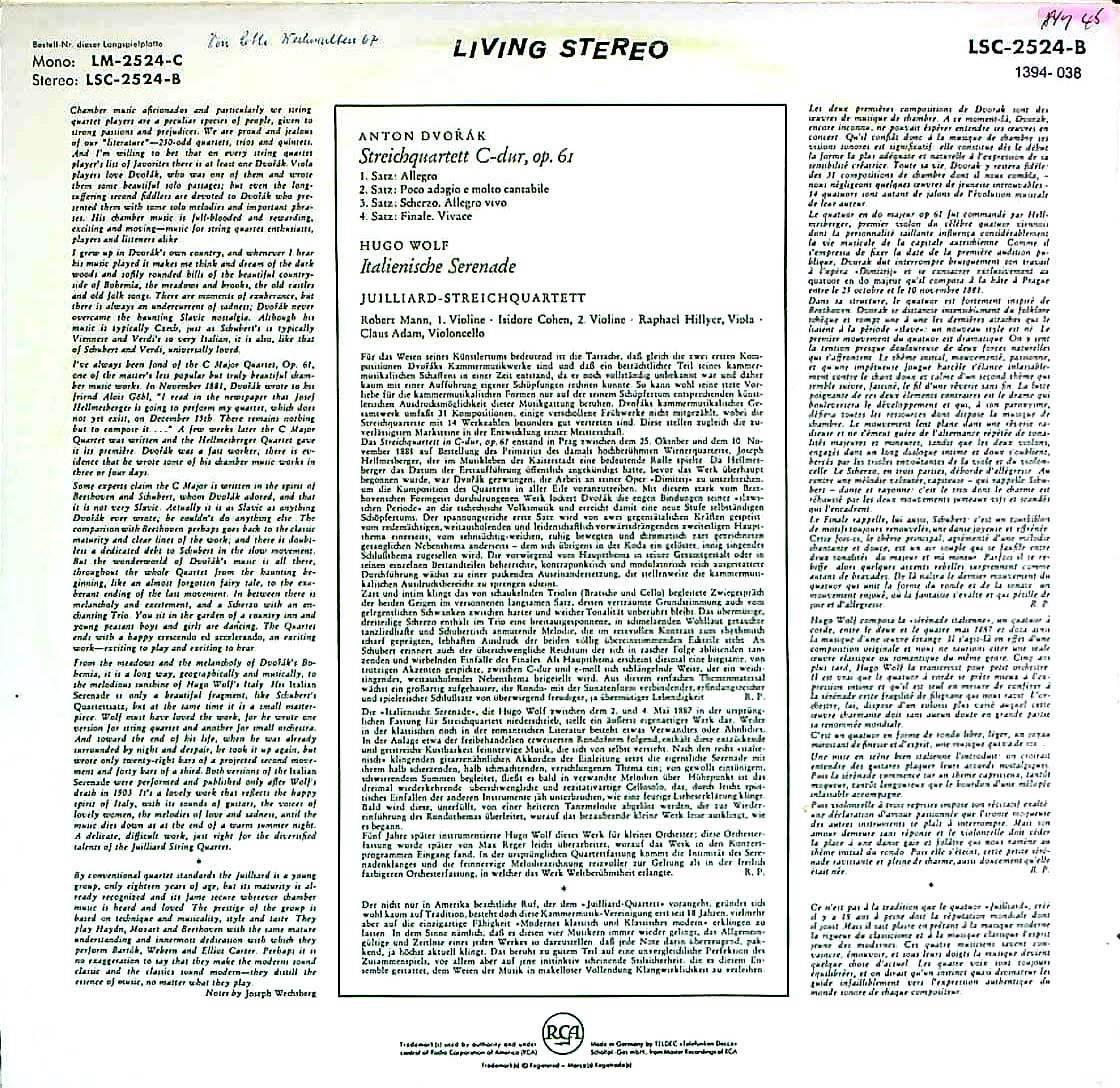 商品コード:1394-038t[RCA] ジュリアードQt./ ドヴォルザーク:弦楽四重奏曲11番Op.61, ヴォルフ:イタリア風セレナーデ