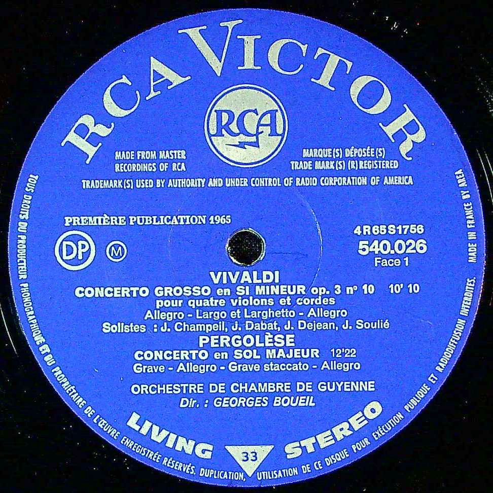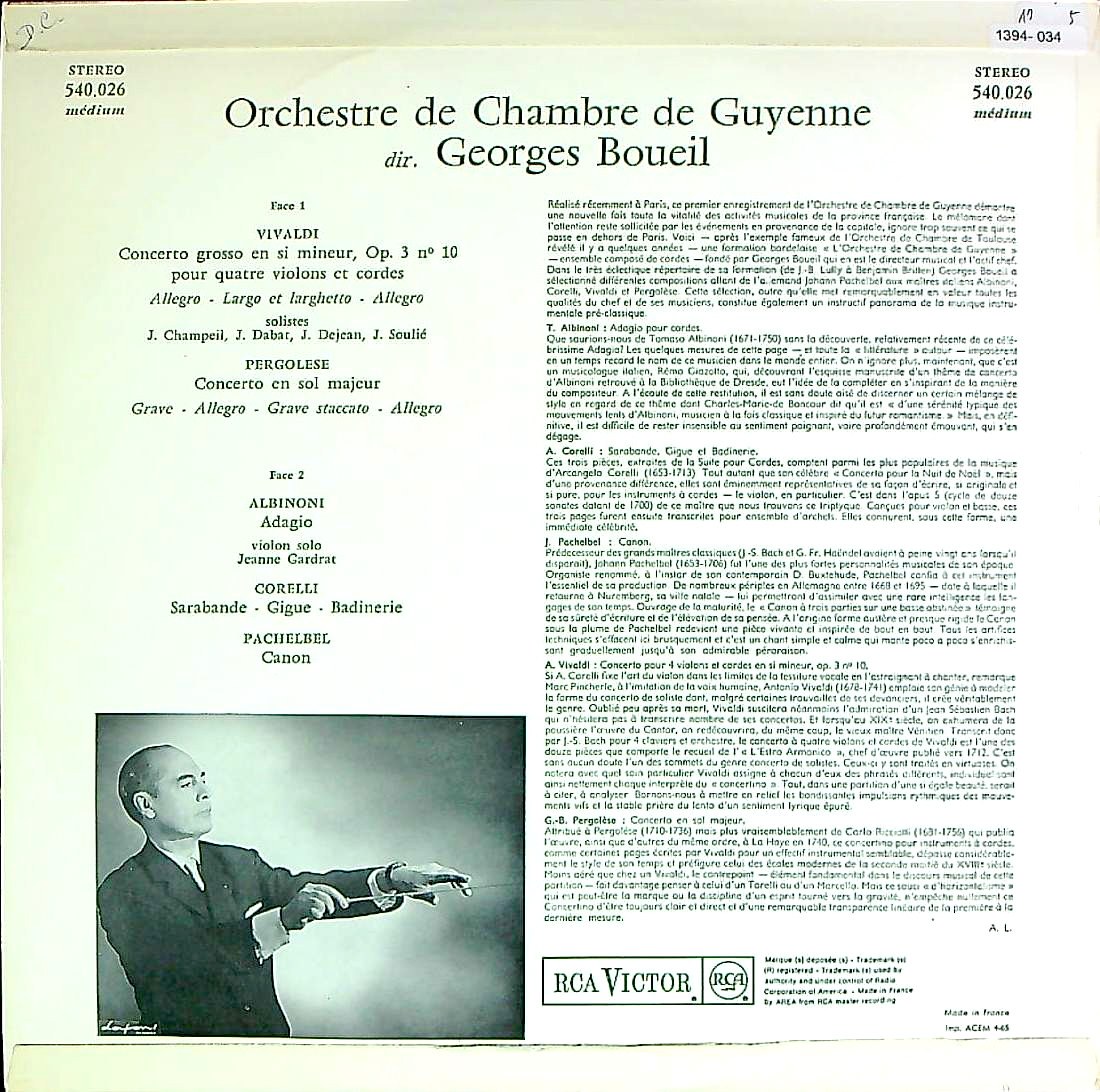 商品詳細:指揮者ジョルジュ・ブエイユに関する情報はない。主にラジオ放送なので放送用録音で活躍したスタジオ・録音指揮者の系譜に属する人物と思われる。ギュイエンヌ室内o.の創設者と思われる。ギュイエンヌはフランス南西部のヌーヴェル=アキテーヌ地域の地方名。ボルドーがこの地域の州都となる。ギュイエンヌという名称の街は存在せず地域名である。ギュイエンヌ室内o.の録音は指揮者ジョルジュ・ブエイユとの共演に限られ録音は多くない。両者の録音はフランスRCAに数点有るだけで全てバロック系作品に限られる。このLPは1965年頃フランスだけの発売と思われる。B面にはアルビノーニ(L.ジャゾット真作):アダージョ、パッヘルベル:カノン、コレッリ(E.ピネッリ編):サラバンド(Sarabande) - ジーグ(Gigue) - バディネリ (Badinerie)と有名曲が並ぶ。中でもコレッリの曲はイタリアの指揮者・作曲家であるエトーレ・ピネッリ(Ettore Pinelli)がコレッリのVnソナタOp.5~弦楽合奏に編曲した作品で、それぞれサラバンド(Sarabande)はソナタ第7番Op.5-7、 ジーグ(Gigue)は ソナタ第9番Op.5-9、バディネリ (Badinerie)はソナタ第11番Op.5-11を原曲としたことが解かっている。この編曲によって、これらの舞曲はコレッリの代表的な作品として広く普及した。現代では様々な楽器編成への編曲譜も出版されている。例を挙げると吹奏楽・アンサンブル、独奏楽器とピアノ、 ヴァイオリン、フルート、チェロなど、様々な独奏楽器とピアノ伴奏、クラシックギターのための編曲版等多くの編曲で親しまれる名旋律である。このLPは全て弦楽合奏で演奏されていて、多くが原曲が弦楽合奏ではないケースも有るが、全て弦楽合奏に編曲された版を使っている。ペルゴレージ:協奏曲 ト長調も原曲がトリオ・ソナタ/シンフォニア/序曲のどれかを編曲し協奏曲とした可能性が高い。まずペルゴレージは協奏曲を作曲していない。20世紀中頃のフランスのレコード制作の現場(特にERATO等)ではソナタ由来の楽章をまとめて「協奏曲」と呼ぶことが頻繁に行われた。聴きやすさとLP商品としての完成度の為の措置であり、当時、学術的厳密さが求められていなかった背景が有る。またアルビノーニ、パッヘルベル:カノン等は既にその方向で(弦楽合奏編曲が定型化した曲であり、これらの定型曲と交ぜ合わせることでLP商品としての価値が高まったのである。現在の原典主義は1990年頃以降に強まった風潮であり、1960年代とは全く状況が異なる点を理解された上で愉しむなら極上のエンタメLPなのである。これはスタジオ編曲LPとしては完成度の高い愉しめるステレオLPである。