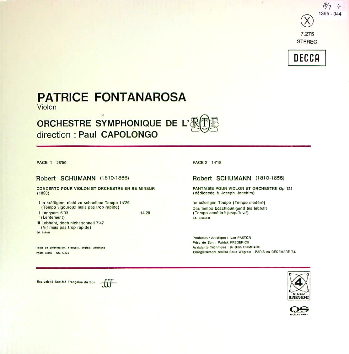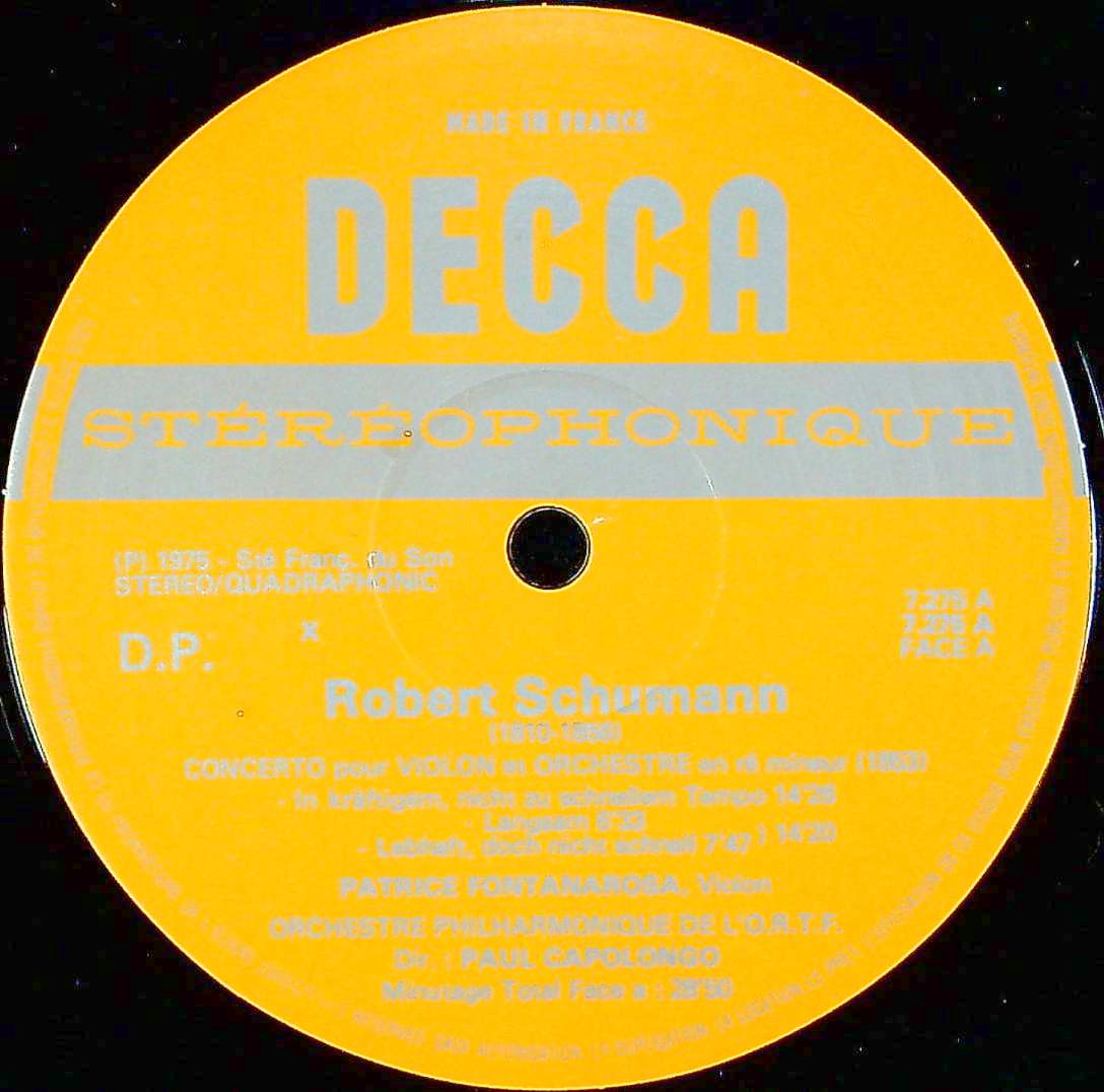 商品コード:1395-044[DECCA] P.フォンタナローザ(vn)/ シューマン:Vn協奏曲ニ短調WoO 23, Vnと管弦楽の為の幻想曲Op.131