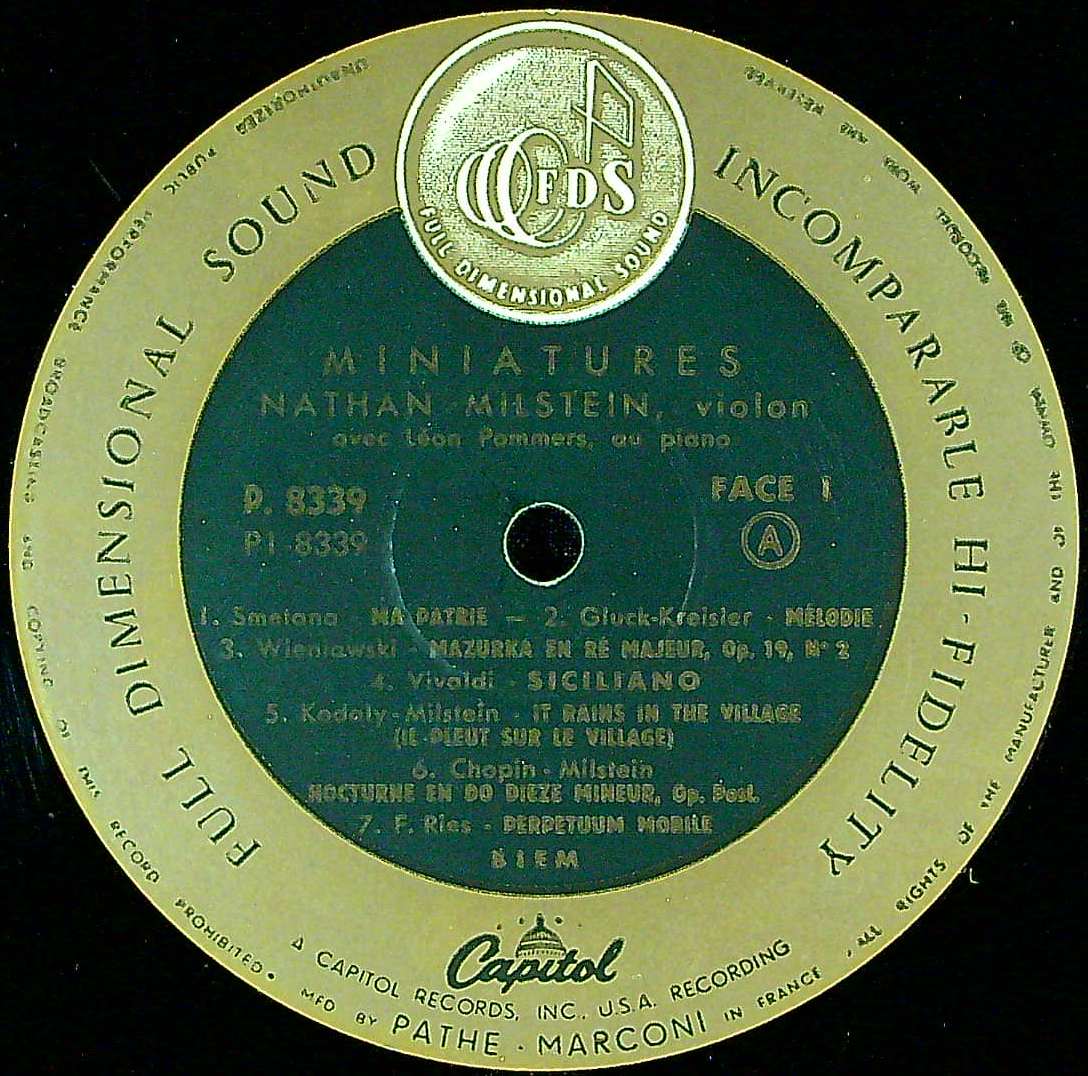 商品詳細:ミルシテインの数点ある小品集の中でも、この“Miniatures"はまとまりが良く、傑作の一つ。殆どの入荷が米盤だった。おそらく、この仏Patheプレスのフラット盤が史上最高の音質と信じる。CAPITOLは元々音圧が高く、音が強いので、力量感はまったく減っていない。しかも、そこにPatheの品の良さと、音の滑らかさ、そして音楽性というスパイスが加わり、これ以上は望めないという音で、ミルシテインのVnを楽しめる。やはりこの音でなければ!これがミルシテインの本来の音だろう。ナタン・ミルシテイン(1904 1992)はウクライナ・オデッサ(オデーサ)生まれのユダヤ系ヴァイオリニスト。英語読みではネイサン・ミルスタインとなるが当社ではナタン・ミルシテインで統一している。20世紀の傑出したヴァイオリニストの一人に数えられている。11歳のときレオポルト・アウアーの招きでペテルブルク音楽院に入学、アウアーのロシア時代の最後の弟子の一人となる。ロシア革命により1917年にアウアーがノルウェーに脱出してしまうと、キエフに戻り、ウラジミール・ホロヴィッツと知り合い、意気投合し、しばしば共演するようになり、1925年には西ヨーロッパでの演奏旅行も一緒に行った。この頃にはウジェーヌ・イザイの門も叩いている。1929年にレオポルド・ストコフスキー指揮のフィラデルフィア管弦楽団によりアメリカ・デビュー。ついにニューヨークに居を構えるが、度々ヨーロッパで演奏旅行に取り組んだ。1942年にアメリカ合衆国の市民権を取得。フランコ・ベルギー楽派の優美な演奏スタイルでその美しい音色から「ヴァイオリンの貴公子」と称される。CAPITOLはミルシテインを擁したことでクラシックファンからどれだけ信頼を得たか分からないレーベルである。正直少なくともクラシック音楽ではさほど大きな貢献のないこの米国レーベルが、業界で名声を持つのはひとえにナタン・ミルシテインの籍があったから、とするのは言い過ぎではないだろう。しかしどの指揮者やピアニストでも、ミルシテインの録音となればそれらは二の次であり、ミルシテインがソロを取ればピアニストや指揮者に対する言及は意味がないとさえ言える。これはいくつかあるピアノ伴奏付きの小品集で米国タイトルは「 Milstein Miniatures」。フランスジャケットでは米国デザインをそのまま使用、裏面のみフランス語に変更している。但しラミネート加工されたフランス製。スタジオ録音されたものだがフランス盤ならば音質には文句のないところ。日本で初期LPの始まりの時期に米国盤を購入された方はおられるだろう。お宝であるに違いないが米CAPITOLの最大の弱点はその強すぎる音質にある。2000年代に入りCAPITOL音源のフランスプレスが入手出来ようになると、昔大枚をはたいた米CAPITOL盤の価値が音をたてて崩れるさまを体験されたことだろう。日本盤→米国盤→フランス盤と順を追って音質が向上してゆく。これは真実なので仕方がない。英国盤も存在するがミルシテインの持つ弦の華やぎを再現するLPとしてフランスPathéプレス以上のLPはないと思う。品物の価値が時間ととも変化するのはLPに限ったことではない。最初からフランスPathéプレスを聴く方より、段階を踏んで来られた方のほうがその価値への認識は大きなものになるだろう。これは特別に録音が良いLP!状態の良いオリジナル盤は少ない!