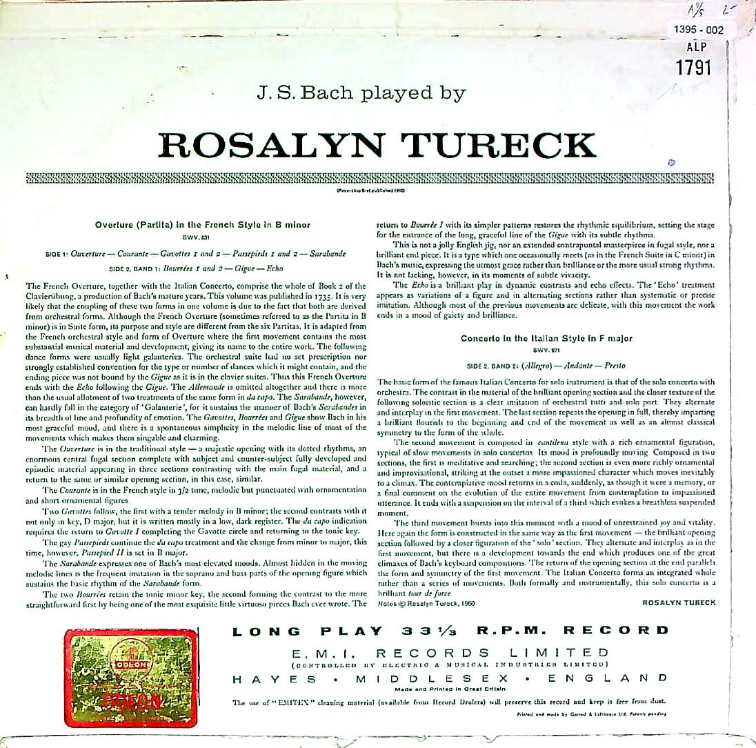 商品コード:1395-002[ODEON] R.テューレック(pf) / バッハ:フランス風序曲BWV.831, イタリア協奏曲BWV.971