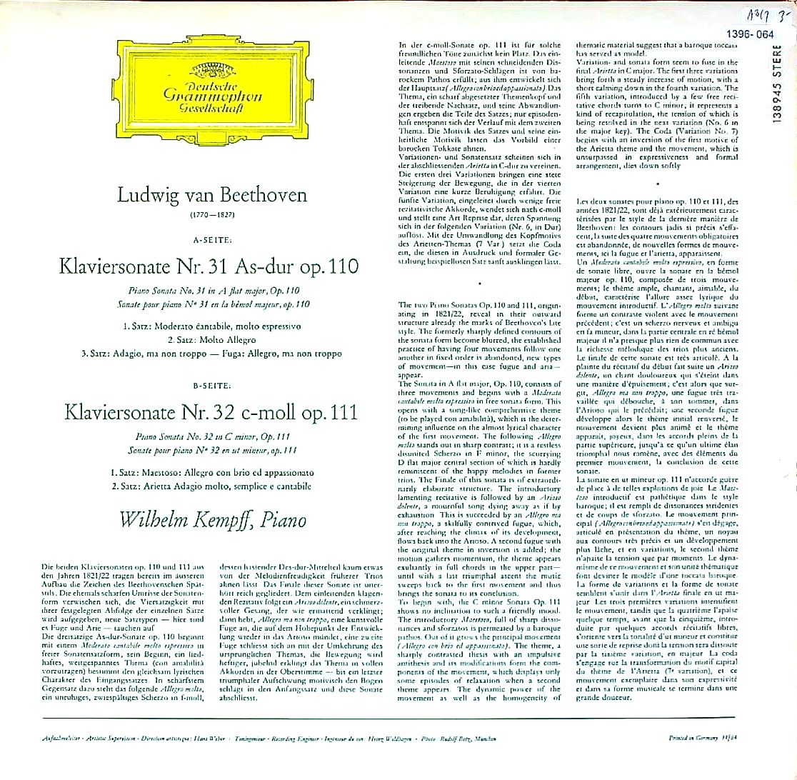 商品コード:1396-064[DGG] W.ケンプ(pf) / ベートーヴェン:Pfソナタ31番Op.110, Pfソナタ32番Op.111