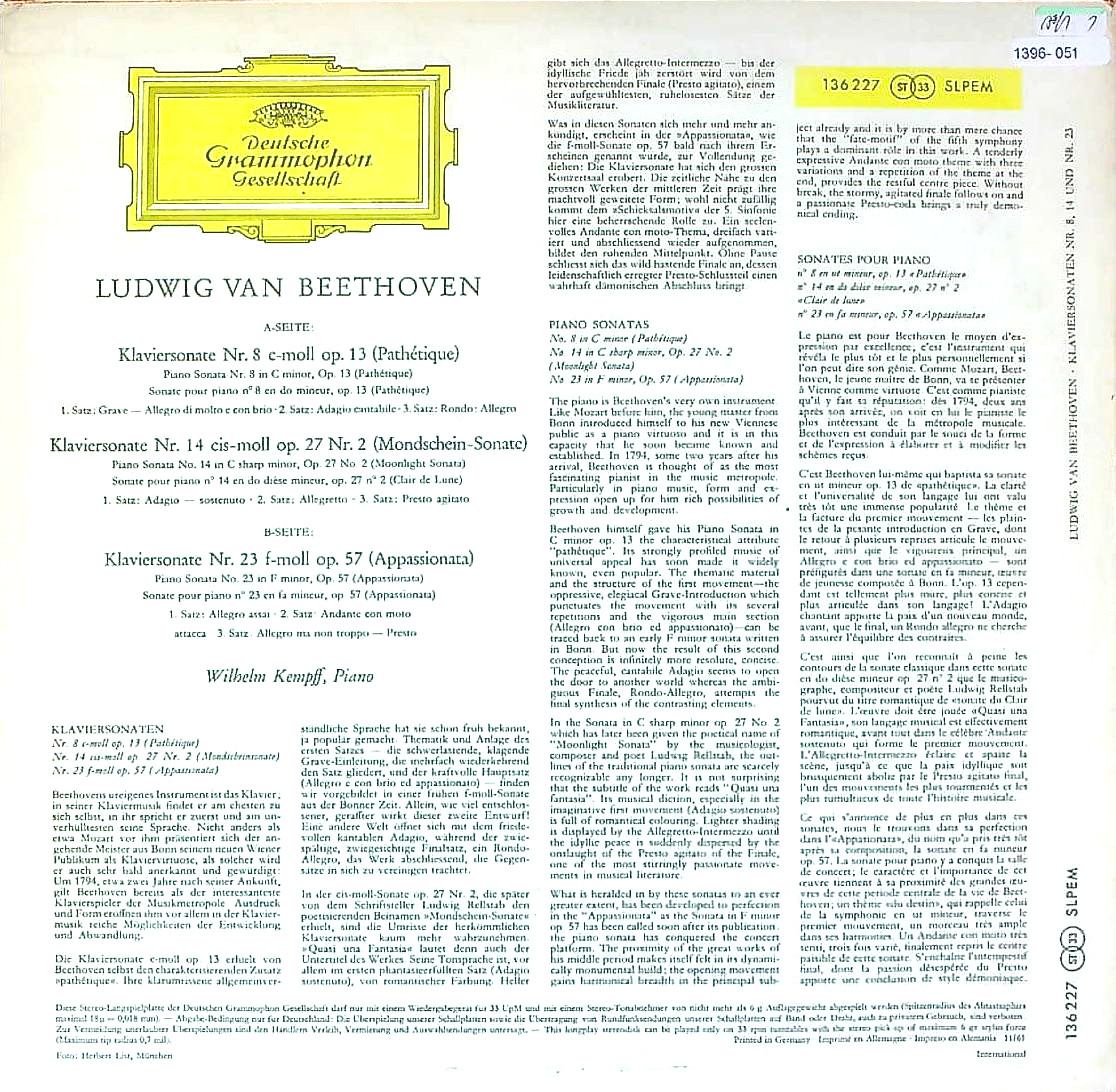 商品コード:1396-051p[DGG] W.ケンプ(pf) / ベートーヴェン:Pfソナタ集/8番Op.13「悲愴」, 14番Op.27-2「月光」, 23番Op.57「熱情」