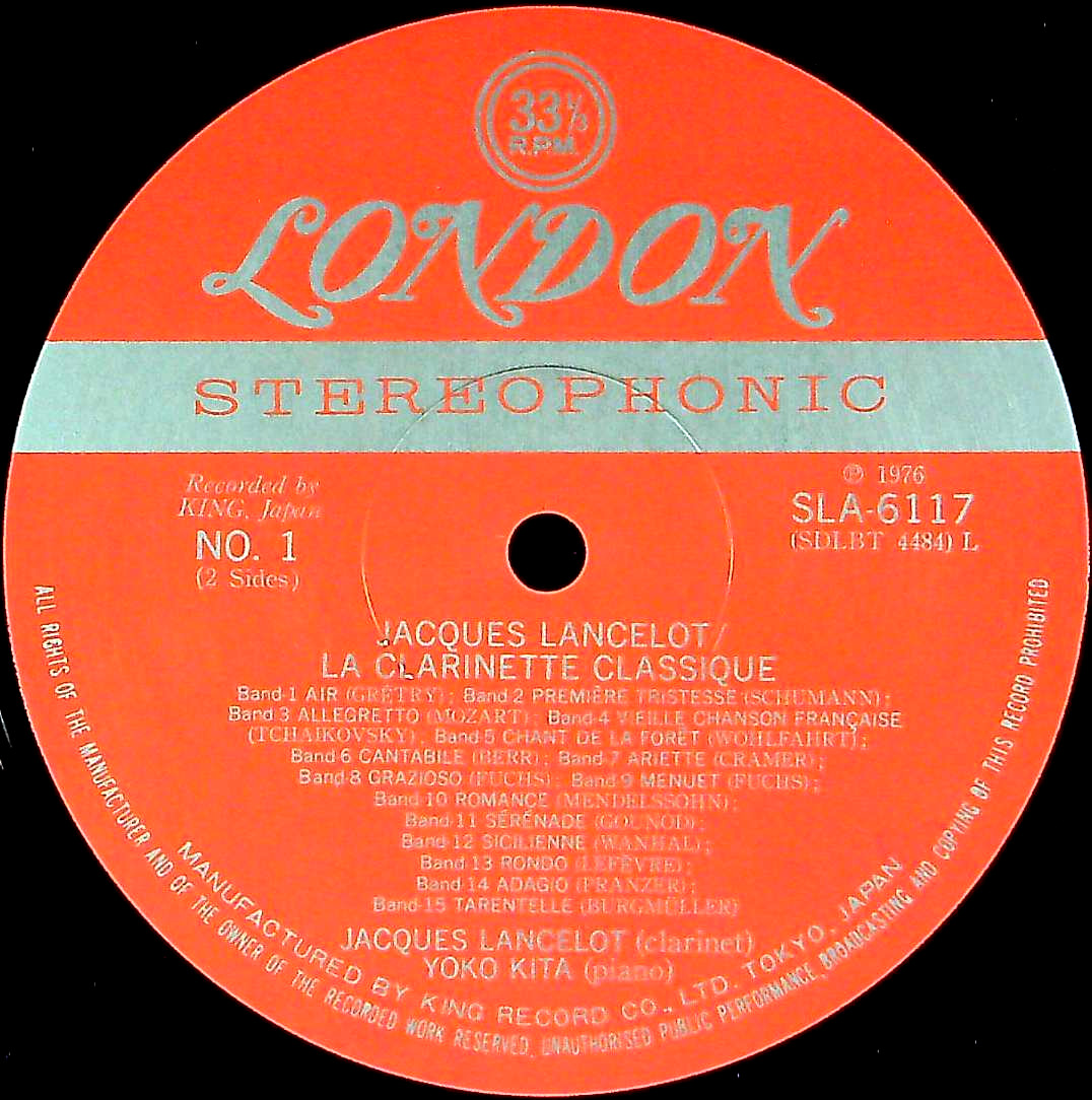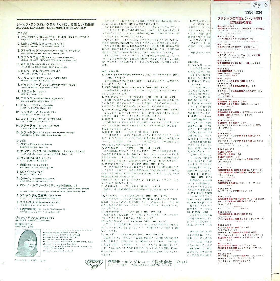 商品詳細:これは1976年にフランスのクラリネット奏者のジャック・ランスロが来日した際に東京の石橋メモリアルホールでの日本録音である。石橋メモリアルホールは東京都台東区にある上野学園大学の音楽学部が設置したコンサートホール施設で創立70周年を記念し、2代目学園長石橋益恵の「良い音楽が生まれ、聴かれますように。人の心が和み、洗われますように」という理念のもと1974年11月に建設された。各種演奏会・講演会の他、能・狂言の公演なども開催される。2021年11月8日にブシロードグループに譲渡され「飛行船シアター」と改称してリニューアルオープンした。来日演奏家が時折演奏会等で使用していた。ピアノ伴奏は喜田容子(KITA Yoko)。経歴等は不明。ジャット裏に小さな顔写真がある。A面15曲、B面10曲の計25曲の小品ばかりを録音。聴いたことのない曲が多い。個々の収録された曲は全て「La clarinette Classique」という4冊からなる楽譜集からきている。この楽譜はランスロ(Lancelot)とクラッセンス(Classens)が選曲・編曲した、クラリネットのクラシック名曲集の楽譜シリーズのことで、初級から上級まで難易度別に『A』『B』『C』などがあり、モーツァルトやブラームス、ガーシュインなど、様々な時代の名曲が収められている。これは楽器(クラリネット)と、その楽器で演奏される「古典的な(Classique)」音楽を指し、特に「モーツァルトの協奏曲」などが有名である。出版社: Combre(コンブル)。鑑賞目的のLPではなく、クラリネット学習者向けの演奏見本のような性格のLPである。但しランスロの演奏は見本を超えた素晴らしいものであり、鑑賞用としても充分に愉しめるLPとなっている。海外で発売されなかったのはこのLPの性格が理由だろう。ERATOから発売されても全くおかしくはなった。ランスロは同時期に本荘玲子(pf)と4曲入りのソナタ集も出していた(SLA 6118)。これまで見る事もなく、存在すら知らなかったランスロの日本録音。日本においてさえ簡単に見つかるLPではない。当盤はフランスから里帰りしたコピーである。フランスでは発売されなかった何よりの証拠となろう。ランスロの新たな側面を見る思いがする。寂しげな小品に美学が詰まっている。