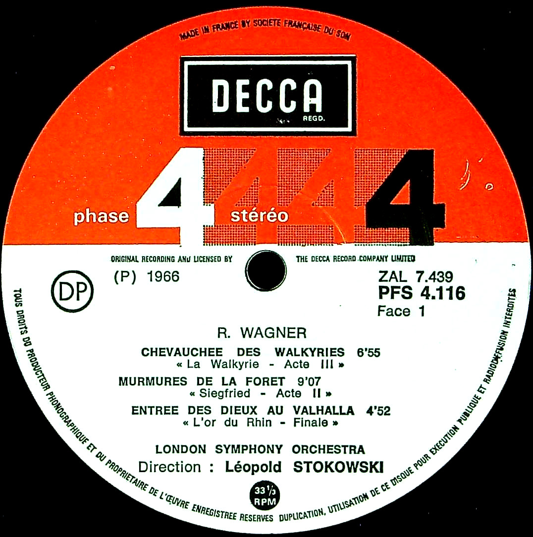 商品詳細:DECCA社では1960年代後半からSXLとは別に、Phase4 stereo コンサート・シリーズというラインナップを作り、1961年頃から始まったオーディオ向けの録音をスタートした。Phase4 stereoシリーズはこれまでの「DECCAツリー」と呼ばれる通常の2chのマイキング・システムとは異なり、当時の最新録音技術である多数のマイク(20本以上の場合も)のマルチ・マイクロフォン・システム録音されミキシング卓で音質調整されたLPという特徴を持つ。従ってこのシリーズではカッテイング・エンジニアと呼ばれるスタジオ技師が大いに活躍するシリーズといえる。多チャンネル録音を人工的ミキシングで制作したLPである。録音後に音像を意図的に左右・奥行き方向へ配置された音場になる。結果、極端に広いステレオと楽器が「飛び出す」ような定位を可能にした新シリーズとなる。自然なコンサートホール再現よりも「録音としての迫力・効果」重視したシリーズで家庭でも効果抜群のLPとなった。背景には米国の新しいトレンドに対抗する意味があったと思われる。特に大編成のオーケストラ作品で効果を発揮した。指揮者もシリーズ選任を限定してスタンリー・ブラック、レオポルド・ストコフスキー、シャルル・ミュンシュ等が選ばれた。日本でもオーディオ評論と密接に結びついたシリーズとして人気を博した。レオポルド・ストコフスキーこそ当シリーズのメインとなる指揮者である。1882年英国ロンドンに生まれ、主にアメリカで活動した20世紀における著名な指揮者の一人。1912-1940年に至るまで、フィラデルフィア管弦楽団の常任指揮者を務めた。ディズニー映画の録音も積極的に行い、クラシック音楽の大衆への普及に努めたが、英国のレコード会社からは冷遇されたようで、DECCA社では、4chシリーズのPFSという番号のシリーズしかリリースされず、SXLの表舞台には上れなかった。メリハリのはっきりしたオケは快く、痛快な演奏。随所にテンポを変えてオーケストラ全体を強烈な節回しで振り回す「ストコフスキー節」が炸裂する。ワーグナーでも持前のパワーで押し切る凄い演奏!