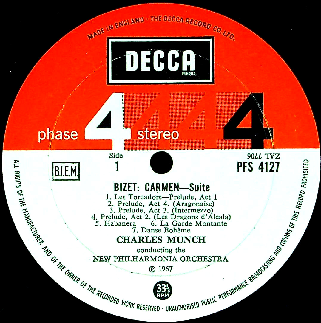商品詳細:DECCA社では1960年代後半からSXLとは別に、Phase4 stereo コンサート・シリーズというラインナップを作り、1961年頃から始まったオーディオ向けの録音をスタートした。Phase4 stereoシリーズはこれまでの「DECCAツリー」と呼ばれる通常の2chのマイキング・システムとは異なり、当時の最新録音技術である多数のマイク(20本以上の場合も)のマルチ・マイクロフォン・システム録音されミキシング卓で音質調整されたLPという特徴を持つ。従ってこのシリーズではカッテイング・エンジニアと呼ばれるスタジオ技師が大いに活躍するシリーズといえる。多チャンネル録音を人工的ミキシングで制作したLPである。録音後に音像を意図的に左右・奥行き方向へ配置された音場になる。結果、極端に広いステレオと楽器が「飛び出す」ような定位を可能にした新シリーズとなる。自然なコンサートホール再現よりも「録音としての迫力・効果」重視したシリーズで家庭でも効果抜群のLPとなった。背景には米国の新しいトレンドに対抗する意味があったと思われる。特に大編成のオーケストラ作品で効果を発揮した。指揮者もシリーズ選任を限定してスタンリー・ブラック、レオポルド・ストコフスキー、シャルル・ミュンシュ等が選ばれた。日本でもオーディオ評論と密接に結びついたシリーズとして人気を博した。ミュンシュの1960年代のDECCA録音はこのPhase4 stereoシリーズに2枚(ビゼー/レスピーギ)存在するだけと思われる。ある意味希少な録音。ミュンシュは丁度この録音をした時期にパリ管弦楽団の首席指揮者に就任してた。だが翌年11月には米国のリッチモンドのホテルで心臓発作のため急逝した。晩年録音の一つである!「カルメン」組曲では第1組曲(全5曲)~4曲と第2組曲(全6曲)~3曲の計7曲を選曲。変則的となっている。「アルルの女」では第1組曲(全4曲)~全4曲と第2組曲(全4曲)~1曲(第4曲)とこちらも変則的な配置。LPの時間制限の為の措置と思われる。この件はジャケットには全く表記されていない。録音当時76歳とは信じ難いパワーで突進するがごとき演奏!