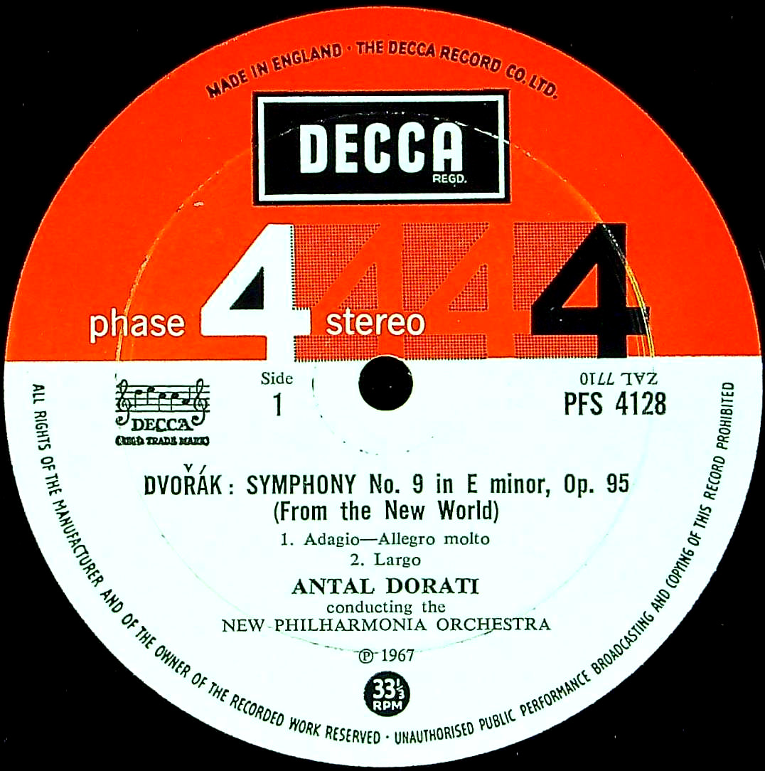 商品詳細:DECCA社では1960年代後半からSXLとは別に、Phase4 stereo コンサート・シリーズというラインナップを作り、1961年頃から始まったオーディオ向けの録音をスタートした。Phase4 stereoシリーズはこれまでの「DECCAツリー」と呼ばれる通常の2chのマイキング・システムとは異なり、当時の最新録音技術である多数のマイク(20本以上の場合も)のマルチ・マイクロフォン・システム録音されミキシング卓で音質調整されたLPという特徴を持つ。従ってこのシリーズではカッテイング・エンジニアと呼ばれるスタジオ技師が大いに活躍するシリーズといえる。多チャンネル録音を人工的ミキシングで制作したLPである。録音後に音像を意図的に左右・奥行き方向へ配置された音場になる。結果、極端に広いステレオと楽器が「飛び出す」ような定位を可能にした新シリーズとなる。自然なコンサートホール再現よりも「録音としての迫力・効果」重視したシリーズで家庭でも効果抜群のLPとなった。背景には米国の新しいトレンドに対抗する意味があったと思われる。特に大編成のオーケストラ作品で効果を発揮した。指揮者もシリーズ選任を限定してスタンリー・ブラック、レオポルド・ストコフスキー、シャルル・ミュンシュ等が選ばれた。日本でもオーディオ評論と密接に結びついたシリーズとして人気を博した。これは1967年の発売。話題性は小さいが注目すべき録音である。SXLでは「新世界より」はクーベリックとケルテスの2回の録音くらいしか無いが、これだけの大曲、もっとバリエーションがあってしかるべき。その穴を埋めてくれるのがこれだ。SXL6000番台(ED2)と同等プレスで、ニューフィルハーモニアを大胆に鳴らすドラティは、ケルテスに引けを取らない。ドラティは1963年から1966年にはBBC交響楽団、1966年から1973年にはストックホルム・フィルハーモニー管弦楽団を引き受けるなど、度々欧州にも来ており、1975-1978年にはロイヤル・フィルハーモニー管弦楽団首席指揮者となり、DECCAに録音を残している。中でもフィルハーモニア・フンガリカとのハイドン:交響曲全曲録音はDECCAを代表する録音であった。大迫力の「新世界より」!普通に聴く限り音質は通常の音の良いステレオと同じ印象!