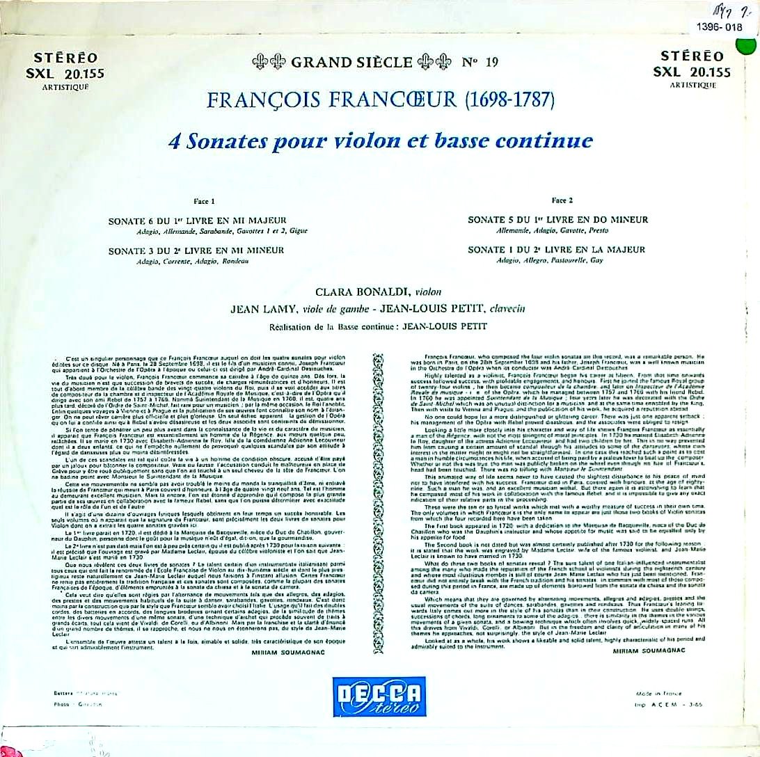 商品コード:1396-018[DECCA] C.ボナルディ(vn) 他/ 「Grand Siècle」Vol.19/F.フランクール:Vnソナタ集/第1巻6番, 第2巻3番, 第1巻5番, 第2巻1番