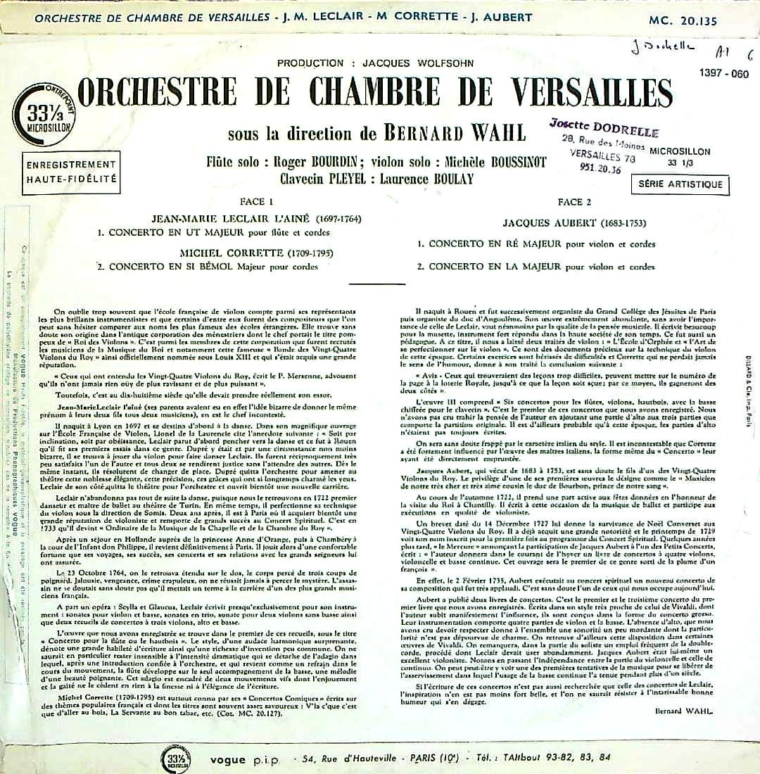 商品詳細:当社CD-Rでその名を知った方も多いはず。フランスの女性ヴァイオリン奏者、ミシェル・ブシノ!圧巻の小品集は殆ど幻に近いLP!これはおそらく彼女の2つしかない公式録音の片方。VOGUE系列のマイナー盤。これはヴェルサイユ室内o.がルクレール、オーベール、コレットの協奏曲4曲を収録したもので、Fl、Vn、弦楽がソロをとる。音はDFをさらに強くしたような絶大なエネルギーが圧倒的。特にブルダンのFlが圧巻。B面2曲のブシノは強烈な存在感!録音は僅か数点しかない彼女の貴重な録音の一つ。ブシノはパリ音楽院で名教授ジュール・ブーシュリ(1878-1962)に師事し、1953年のロン=ティボー国際コンクールのヴァイオリン部門で入賞した。この年はコンクールの創設者のジャック・ティボー(1880-1953)が審査員を務めた最後の年だった。ティボーは同年の9月に日本公演に向かう途中の航空機事故で73歳で命を落とした。このコンクールの審査員の一人だったダイヴィド・オイストラフ(1908-1974)はソ連政府を説得してブシノを助手にした。フルートのロジェ・ブルダン(1923-1976)はパリ音楽院のマルセル・モイーズ(1889-1984)のクラスで薫陶を得た名手。1943年からヴェルサイユ音楽院の教授に任命され、生涯その地位にあった。