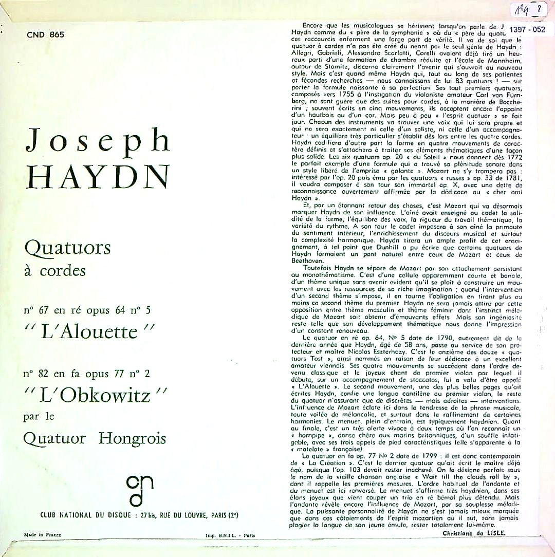 商品コード:1397-052[CLUB NATIONAL] ハンガリーQt./ ハイドン:弦楽四重奏曲67番Hob.III:63「ひばり」, 82番Hob.III:82「雲がゆくまで待とう」
