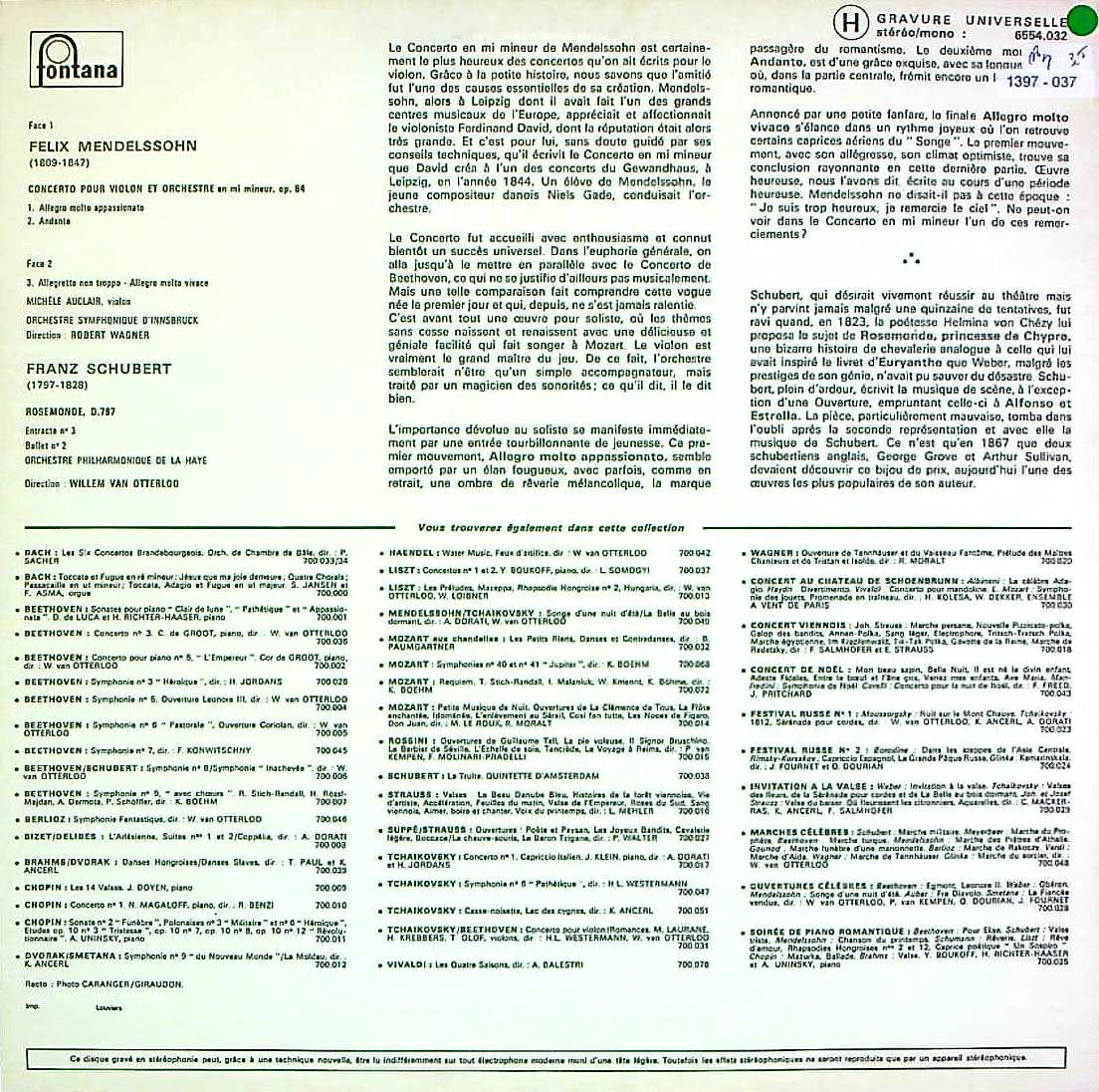 商品コード:1397-037[FONTANA] M.オークレール(vn)/ メンデルスゾーン:Vn協奏曲Op.64, シューベルト:ロザムンデD.797~第3曲&第9曲