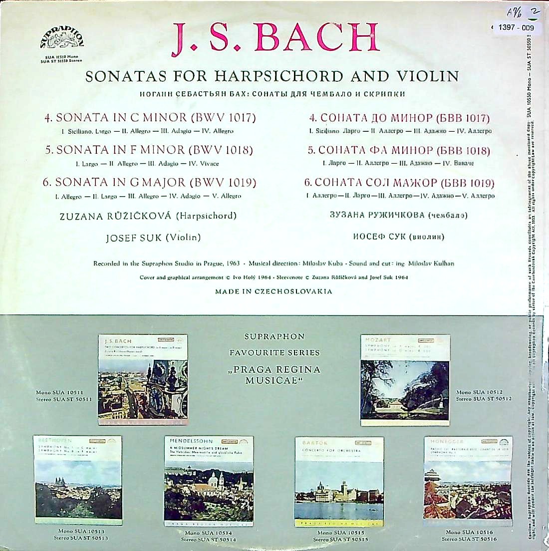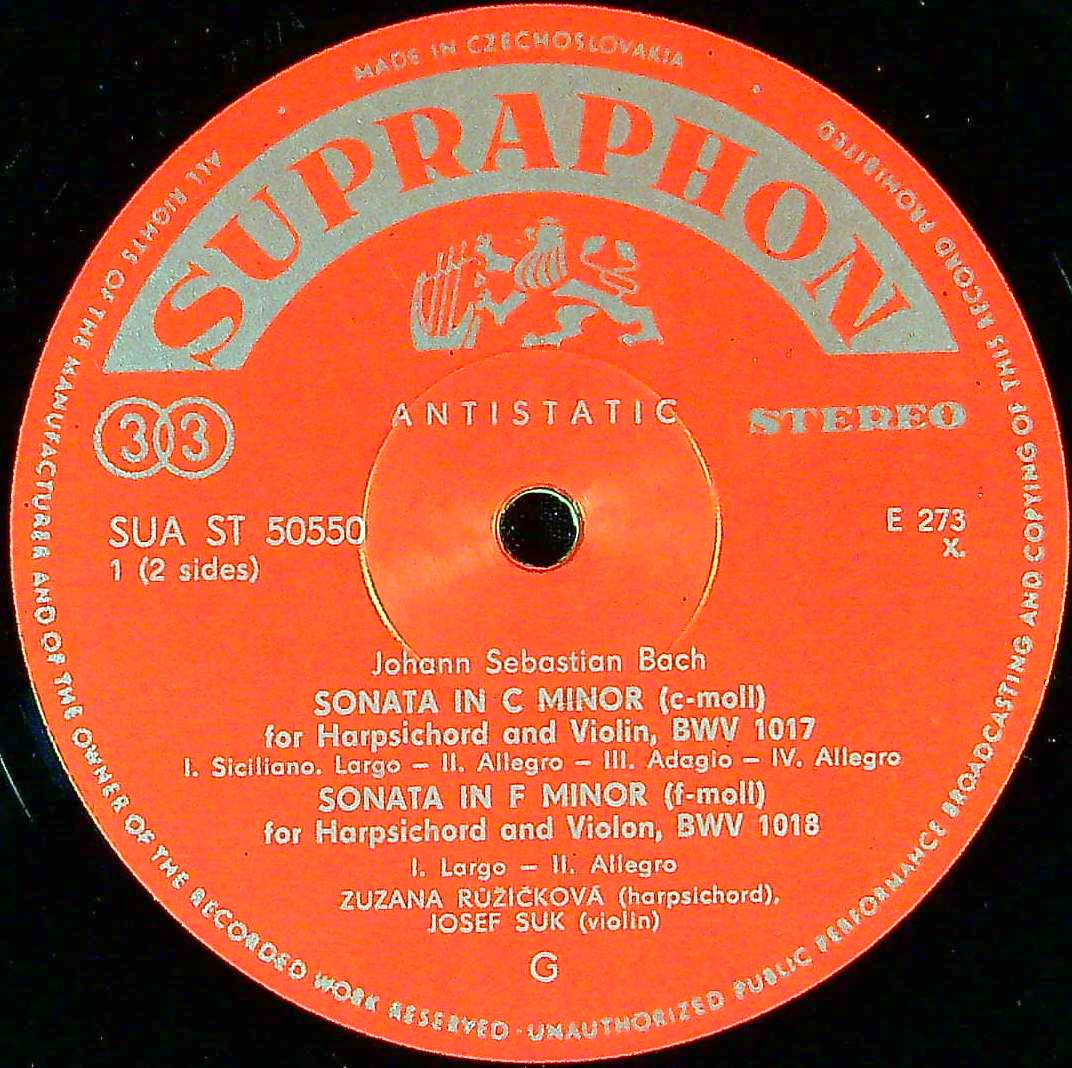 商品コード:1397-009[SUPRAPHON] J.スーク(vn) Z.ルージチコヴァー(cemb) / バッハ:Vnソナタ全集vol.2/Vnソナタ4~6番BWV.1017~1019