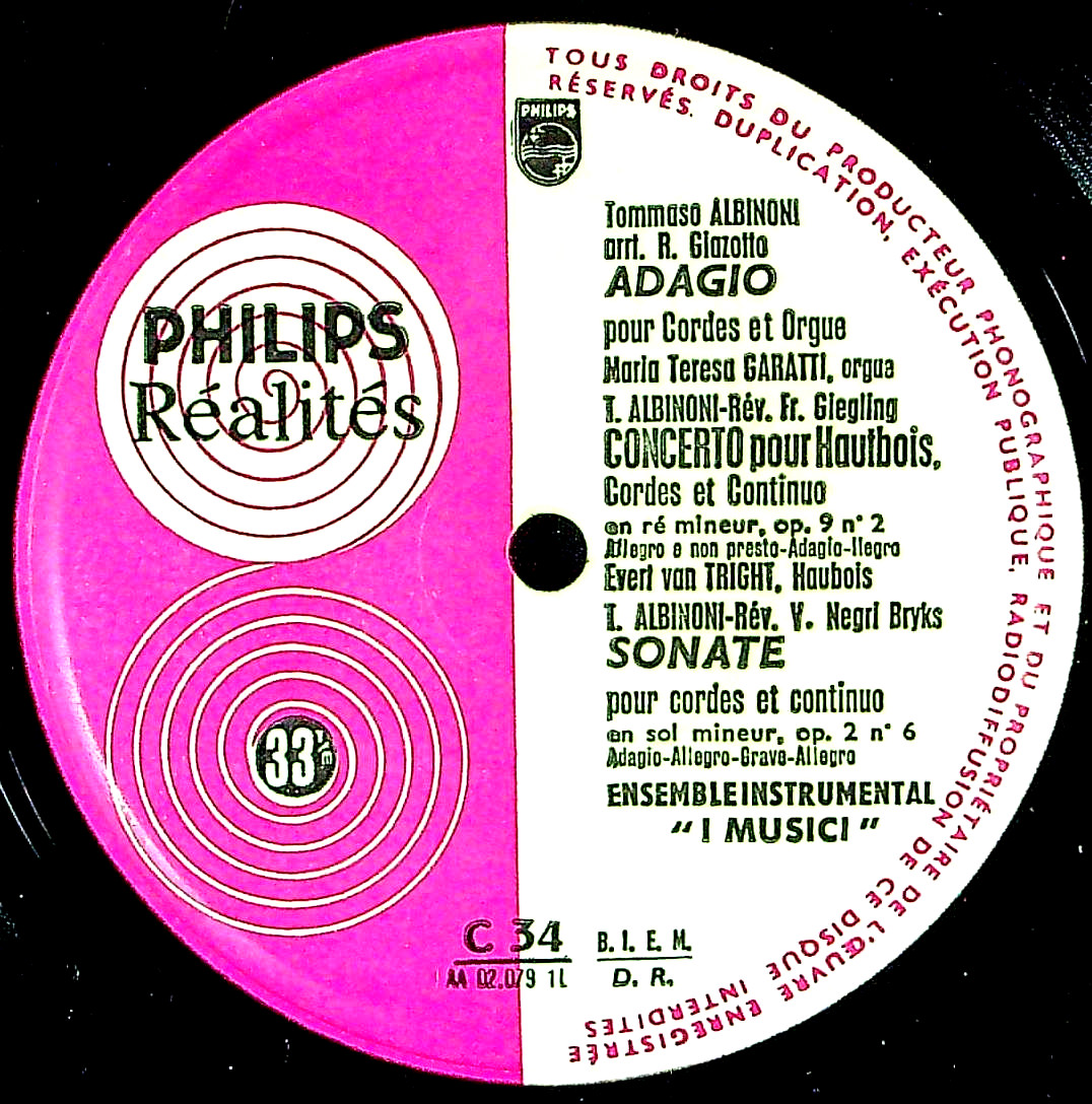 トピックス:仏ピンク白Realitesカマボコ外溝厚, 両穴内袋(ジャケ欠), アダージョはL.ジャゾットの作曲だが伝アルビノーニで広く知られる, 仏の数量限定プレス, レア!, 蘭ではL 02 079 L/835 235 LY, モノラル初入荷, 仏オリジナル