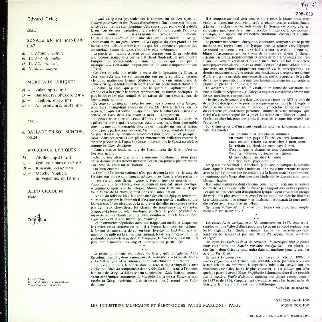 商品コード:1398-030[COLUMBIA] A.チッコリーニ(pf) / グリーグ:Pf作品集/PfソナタOp.7, 抒情小品集(抜粋7曲) 他