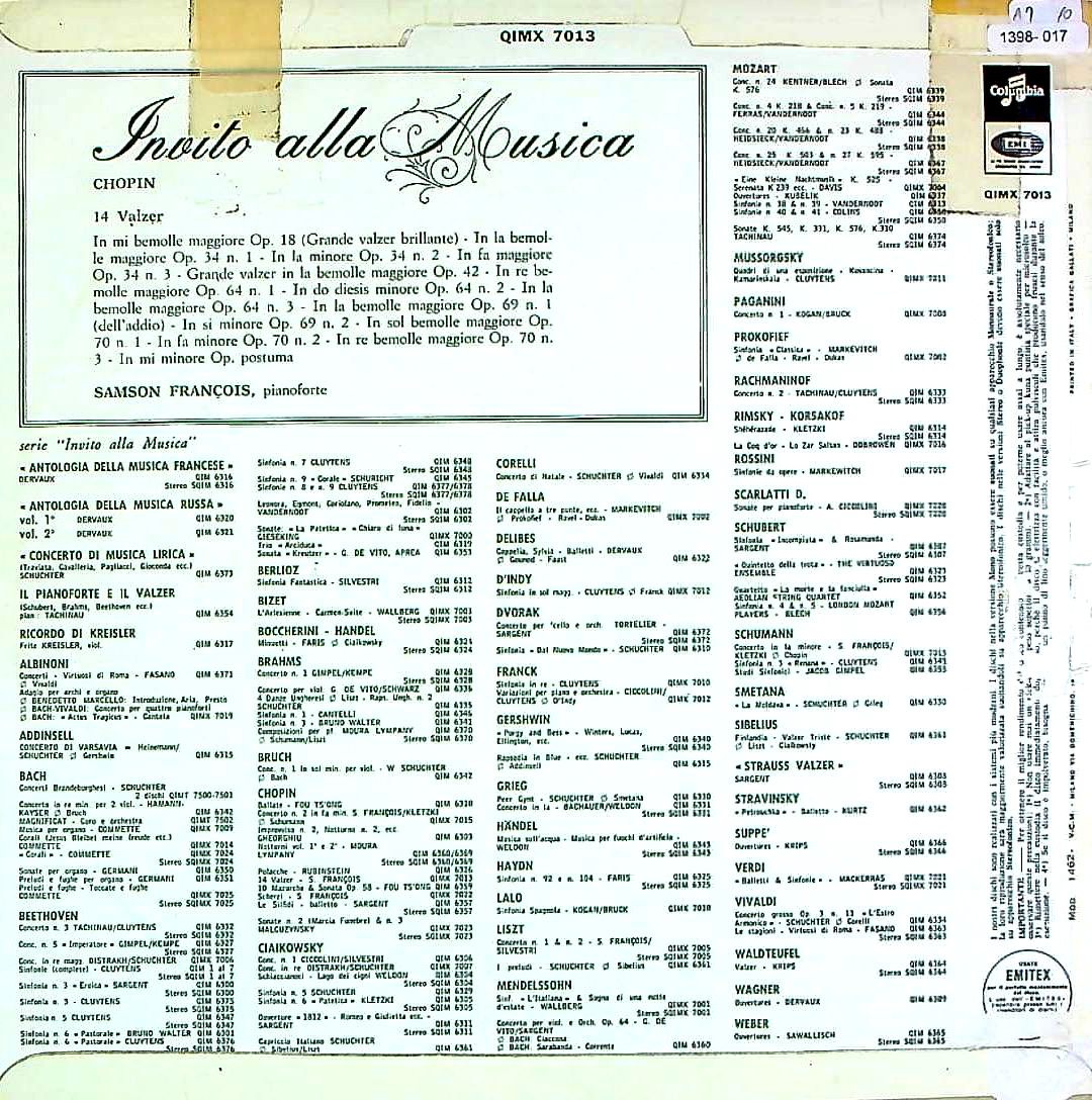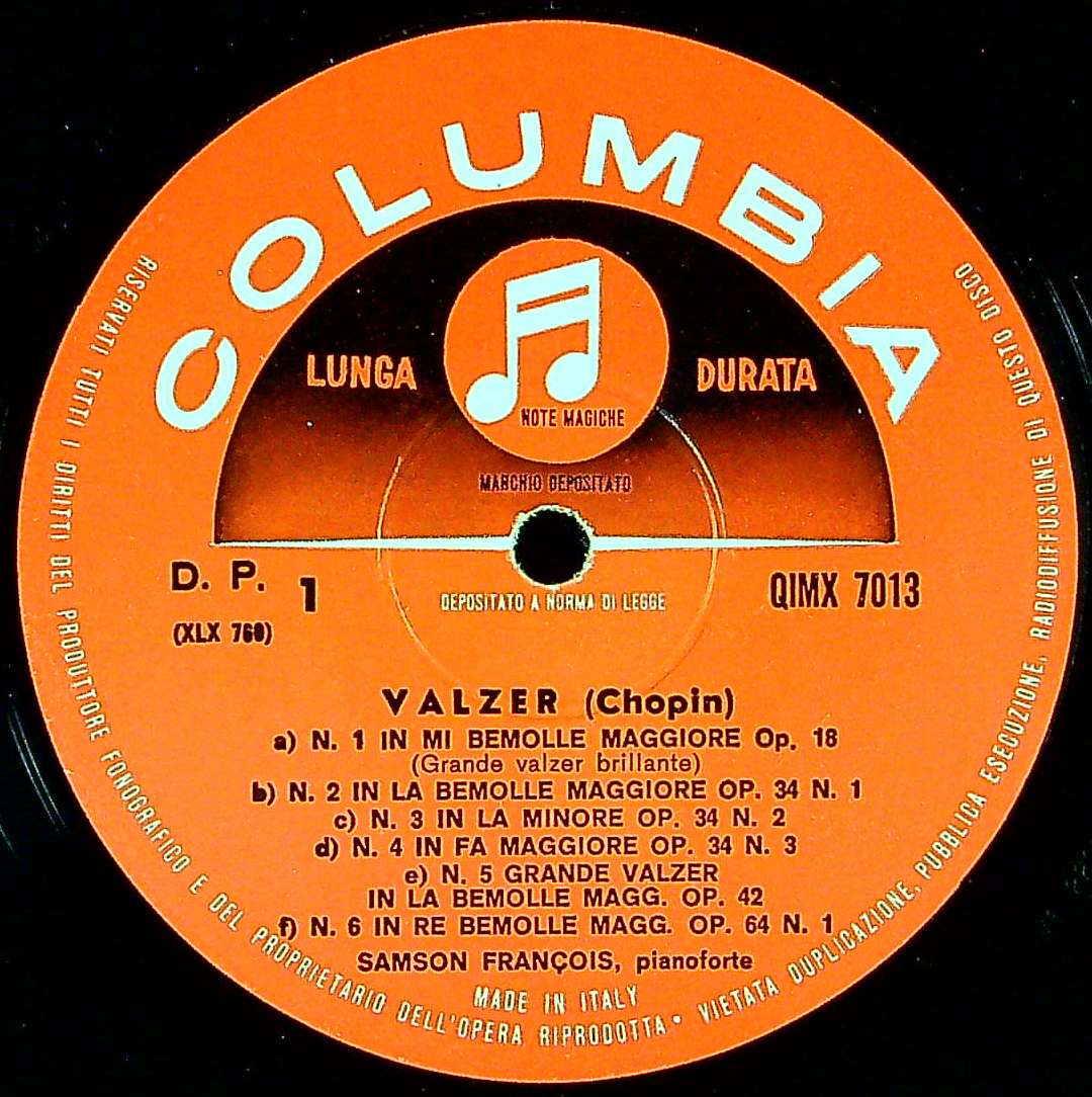 商品詳細:ごく最近フランソワがショパンの14のワルツを2回録音していたことが判明した。きっかけはFCX 30205というどう見ても再版にしか見えないフランソワのワルツ集を調べていたときに、何故かその仏プレスは1963年1月録音ではあり得ないフラット重量盤であったからである。オリジナルが紺/銀音符段付きグルーヴガード厚手レーベルで再版がフラット重量盤という事はいかなフランスでもあり得ないことである。そこでFCX 30205は1958年のモノラル旧録音であることが判明した。これまでFCX 30205を1963年録音のモノラル再版として販売してきたので、運よく安価で購入されたお客様は実に幸運であったことを述べたい。一見華やかに弾いているが根底には自虐的なものを感じてしまう独特の世界観がある。彼は根っからのエンターテイナーだったようで、サービス精神の豊かさか、聴衆を素直に喜ばせるスタイルを作ったとも思える。テンポは勝手気ままに、瞬時に変化する。通常の人と逆のアーティキュレーションをとったりと、自己をこれでもかと表現した彼だが、レコーディングは大変で、1枚作るのに何日もかかったようだ。モノラルだが音は良過ぎるくらい良い。イタリア盤のマトリクスがXLX 760/XLX 761でありこれは1958年のモノラル旧録音のフランス盤と同じである。これは1958年のモノラル旧録音であることを意味する。新録音のマトリクスはXLX 10176/XLX 1017でなければならず、今回はマトリクスから録音年を導いた例として、長年マトリクスを表示してきた意味を感じた例である。イタリア盤のレーベルは英国とそっくりの赤白SC音符レーベル。盤も厚手ではっきりとした良い音質! 新録音より力強くパワーを感じる旧録音!新しい発見!