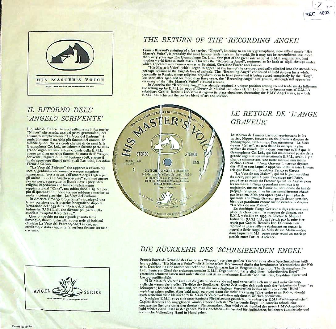 商品コード:REG-4602[英HMV ] E.シュヴァルツコップ(s) G.ムーア(pf) / 「ブラームス:ドイツ民謡集(全42曲)」~21曲