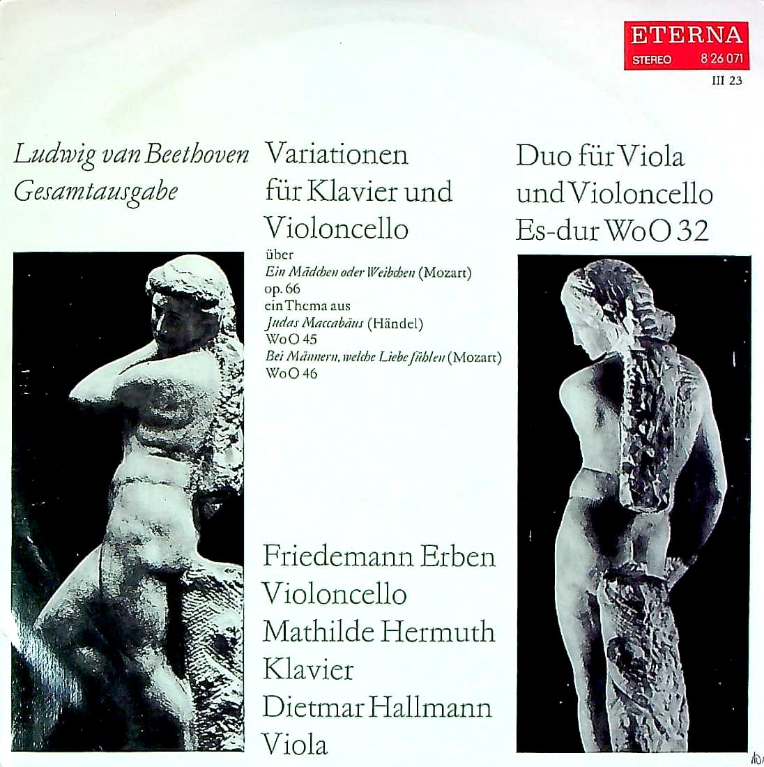 商品詳細:ベートーヴェン完全大全集の中の一枚。カテゴリー: Ludwig van Beethoven Gesamtausgabe – Ⅲ-1.3212。モーツァルト:「魔笛」のアリアの主題による変奏曲2曲、ヘンデル:「ユダス・マカベウス」のアリアの主題による変奏曲、そしてVa・Vc二重奏という普段あまり演奏されない作品を収録。通常はチェロ・ソナタ集などの余白に収録されるようなマイナー作品だが内容は流石に良い。変奏曲だけのカップリングで、製作される機会が少ないのが現実。しかしモーツァルトにも通じる古典的美しさを持ったベートーヴェンの素晴らしい作品たちである。ボッセ・トリオ等で活躍するF.エルベンのVcを始め、演奏も素晴らしく、ベートーヴェンの魅力を改めて聴く事になる一枚。ETERNAでのベートーヴェン:チェロ・ソナタ全集は彼らではなく、ルーマニアのアルドゥレスク(Vc)が担当した。エルベン(vc)はチェロ・ソナタ集は録音していない。