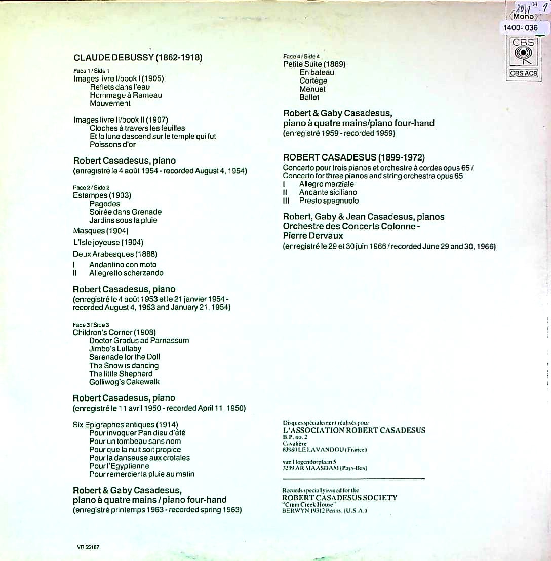 商品コード:1400-036[CBS] R.カサドシュ(pf), G.カサドシュ(pf) 他/ カサドシュ協会Vol.8/ドビュッシー:映像第1集&第2集, 版画, マスク, 喜びの島, 2つのアラベスク 他