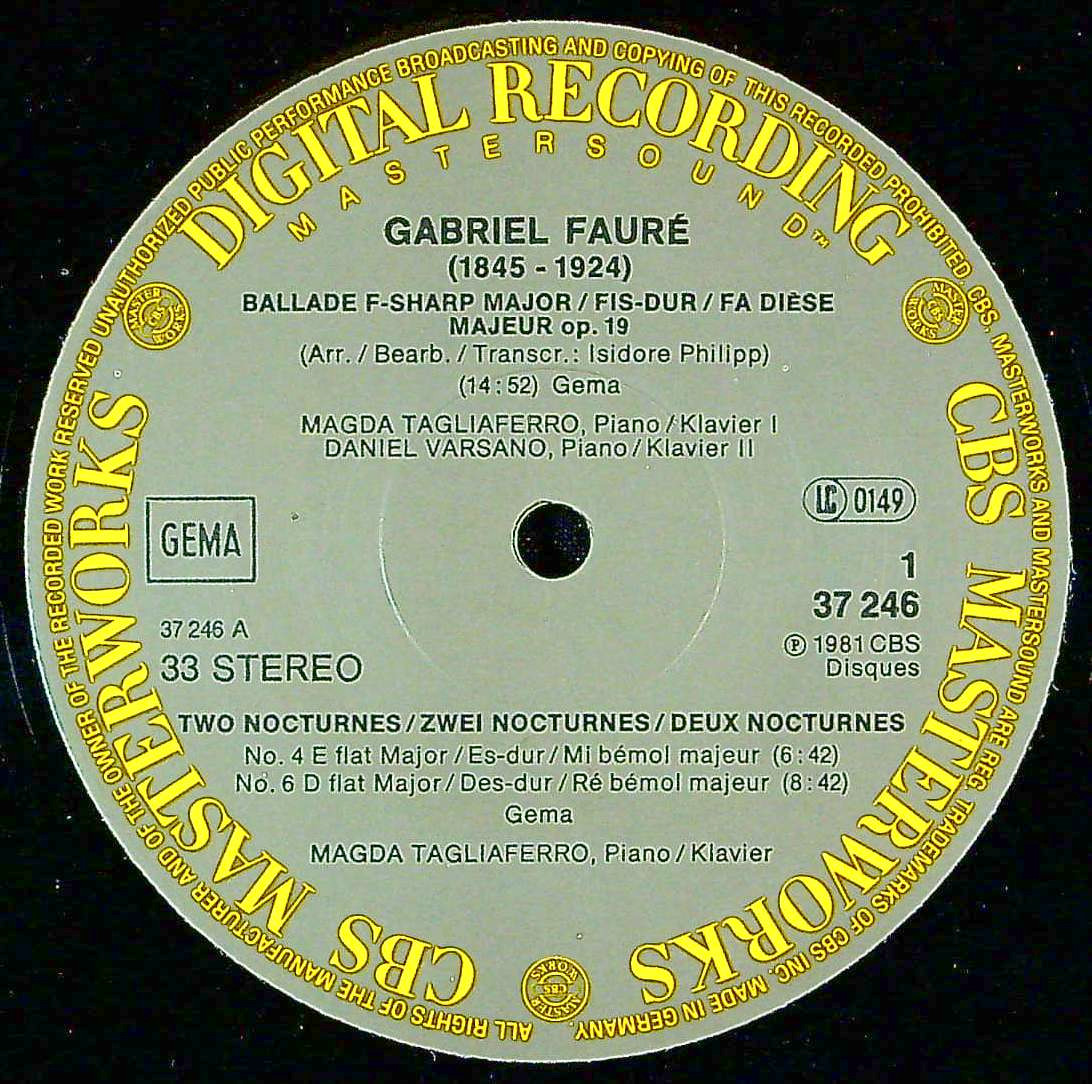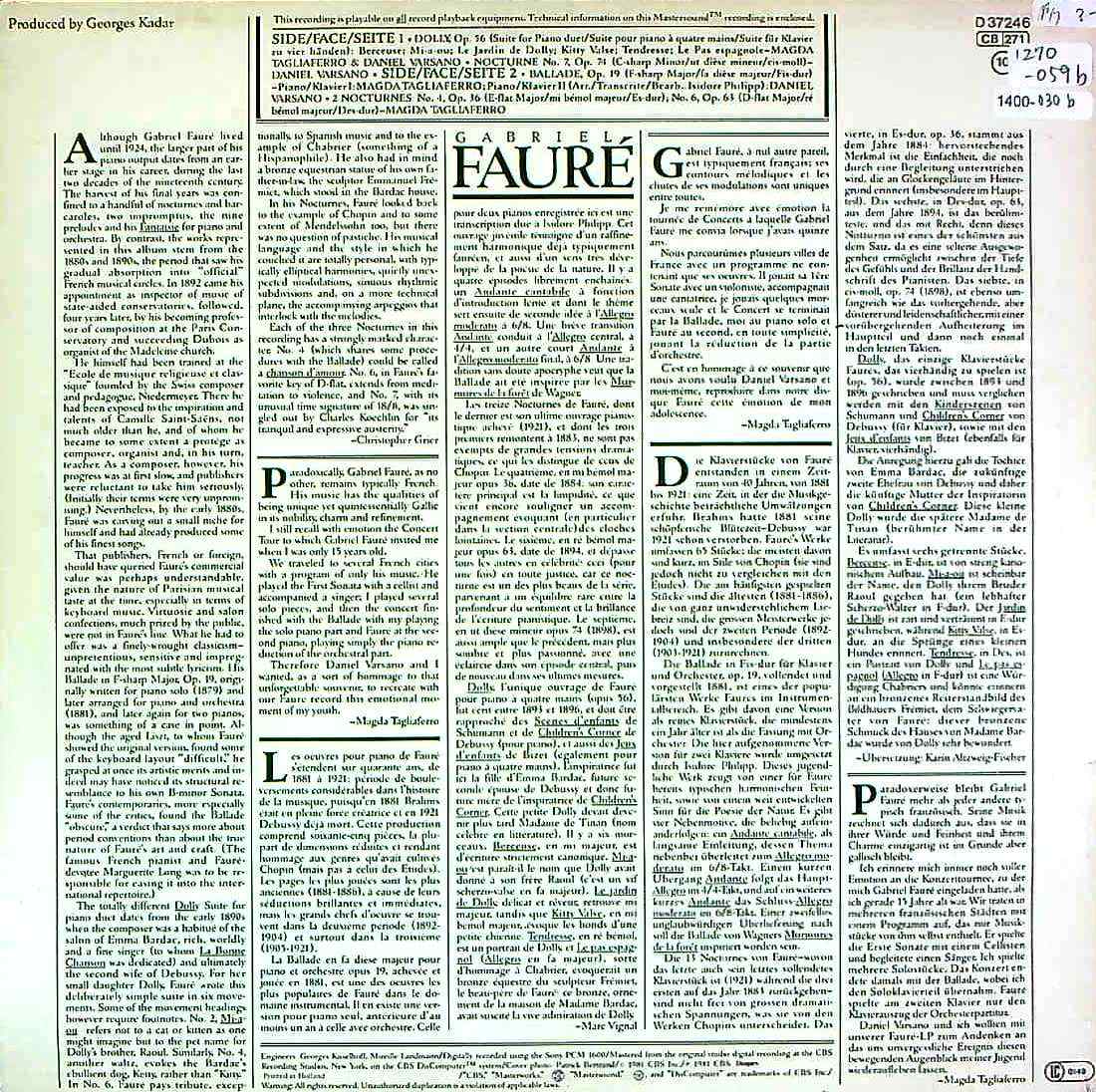 商品コード:1400-030b[CBS] M.タリアフェロ, D.ヴァルサーノ(pf) / フォーレ:ドリーOp.56, バラードOp.19, 夜想曲4番Op.36, 6番Op.63, 7番Op.74